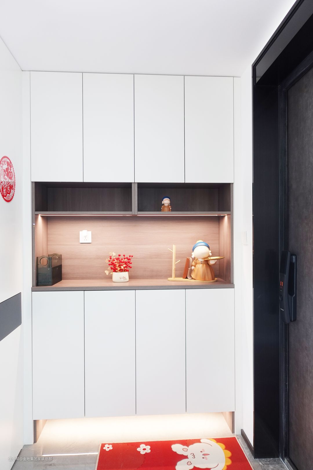 玄关处柜体的柜门均为白色吸塑门板,采用无门把设计,中部镂空用于放置摆件和其他小件物品,内设灯带,暖色光线映射在装饰摆件上,稍显可爱。