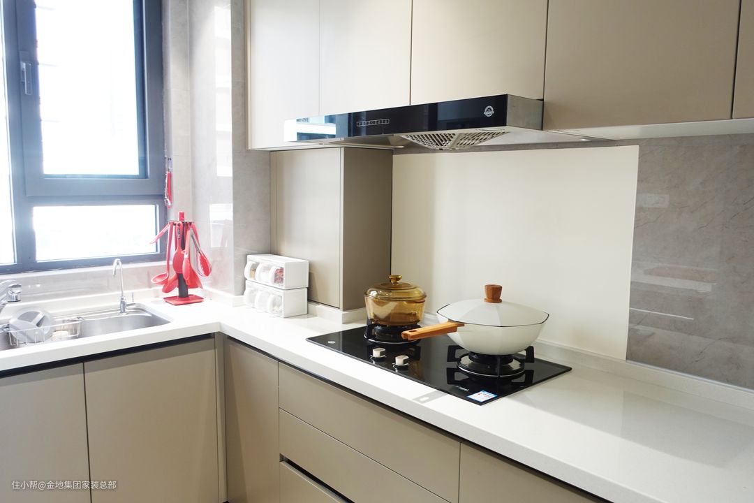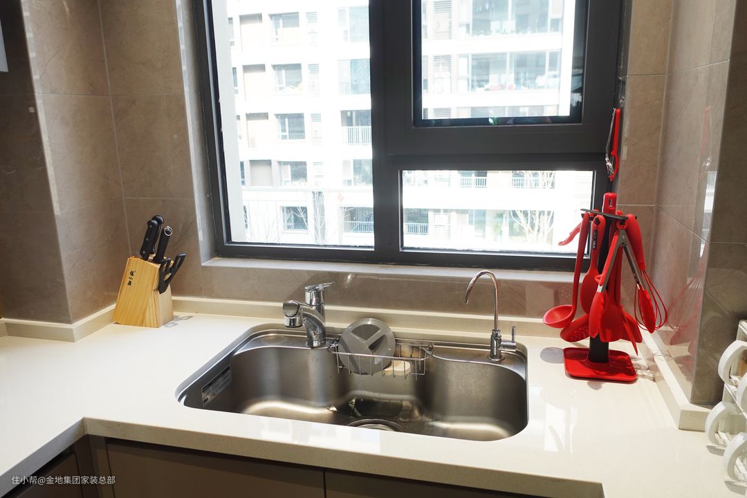 浅咖色的柜体均采用无门把设计,柜体通顶。右下角柜体中空,用来放置垃圾桶。垃圾桶为干湿分离垃圾桶,分为两层,方便主人进行垃圾分类,非常省心~底部安装滑轮,做饭时可以拉出使用。垂直式油烟机嵌入柜体,既美观又节省空间。燃气灶内嵌,灶台上下方的柜门分别设置了透气孔,有效保证厨房安全!灶台靠墙一侧的白色方块为遮油板,有效防止油烟侵染墙体,实在是厨房神器!另外洗碗池配置了一个小小的沥水篮,洗完东西可以避免将水珠滴得到处都是啦。
