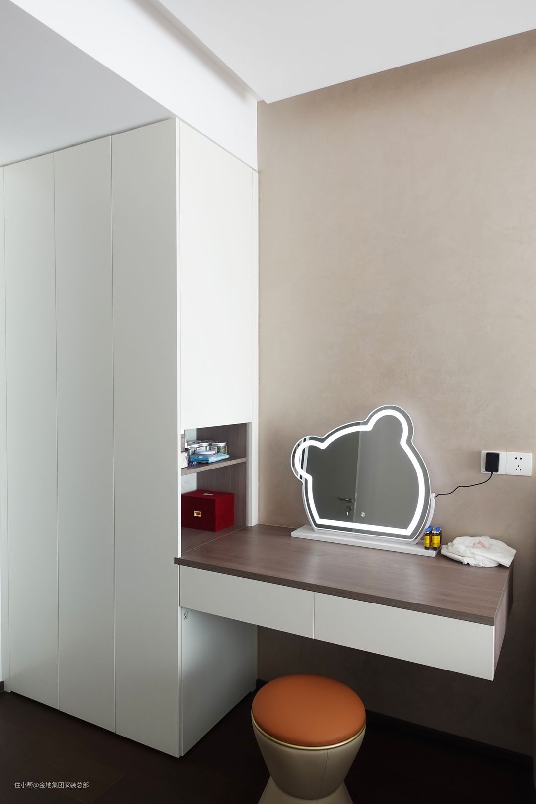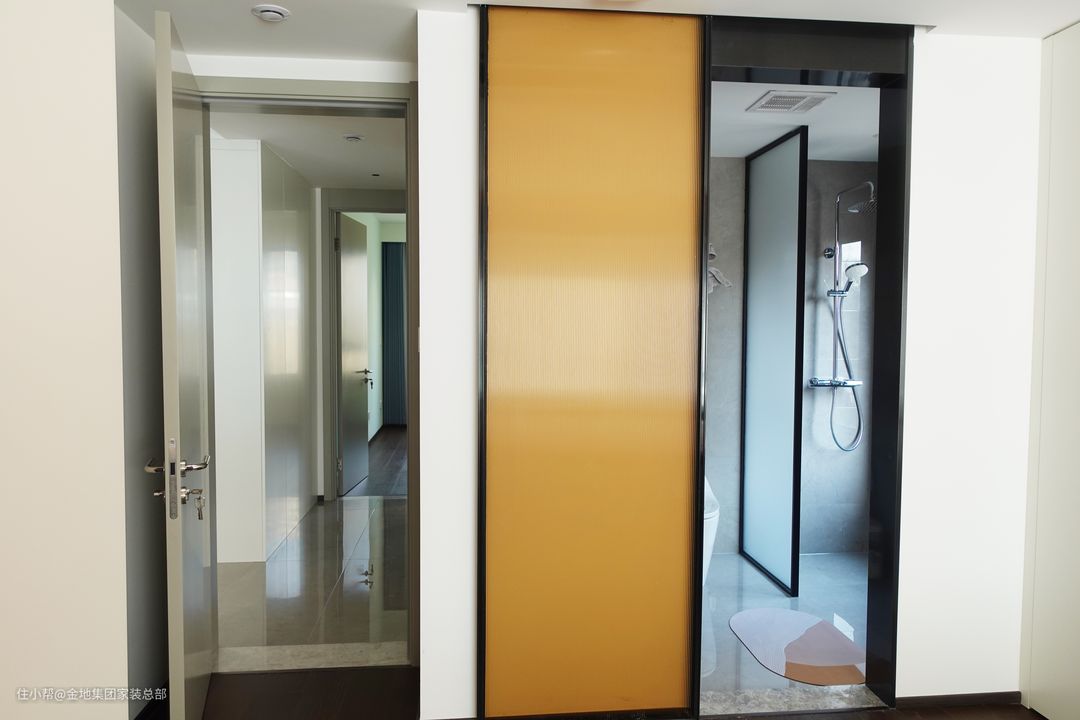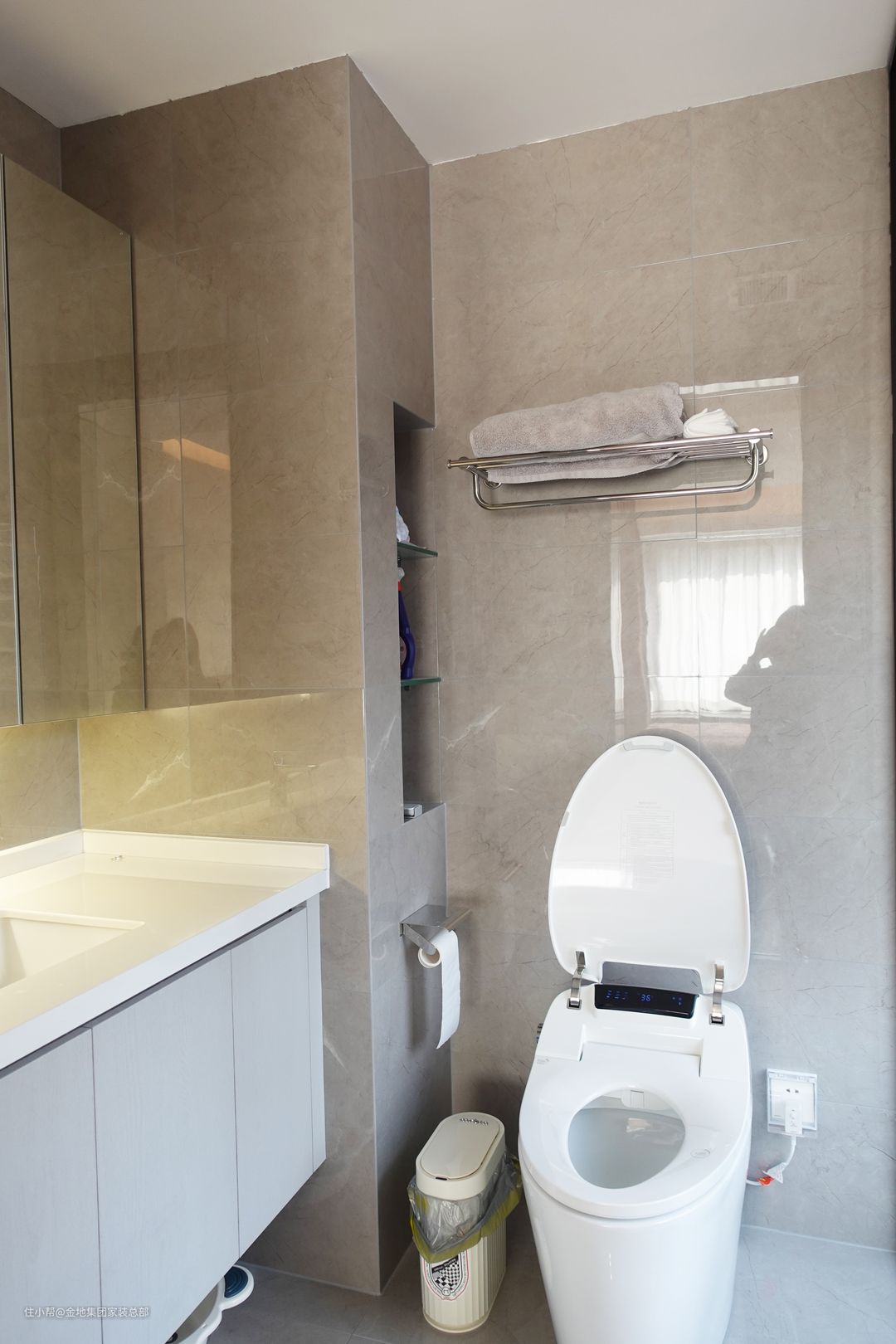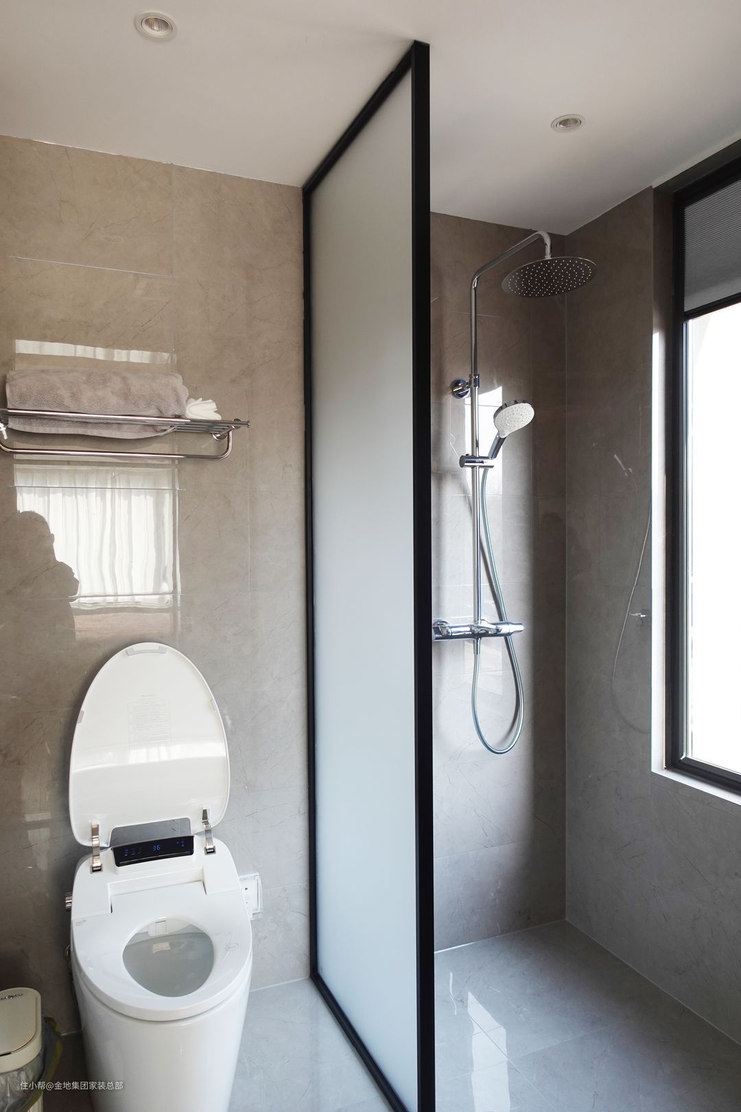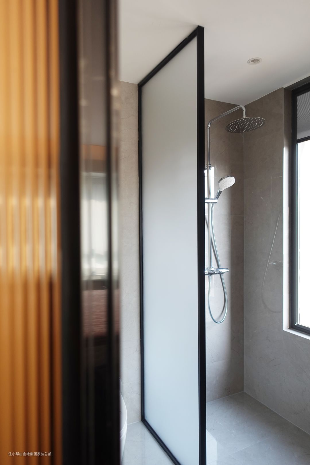 主卧的卫生间在门口位置,淋浴间为流行的开放式半隔断,马桶和淋浴间用一面黑框磨砂玻璃进行简单的干湿隔离, 留白艺术简单高级。一米宽的半隔断也能有效防止水珠喷溅,另一侧地面铺设防滑吸水垫,美观安全。马桶左侧墙体做了壁龛,可以放置纸巾、毛巾等小日用品,上厕所时也能随手安防手机等物品,十分便利。洗手台上方的柜体与墙体颜色统一,不会显得杂乱突兀,同时增加大量收纳空间。 公卫位于主卧和儿童房之间,对大人和小孩来说都很方便,公卫的布局和主卧卫生间相似,保持风格的一致。