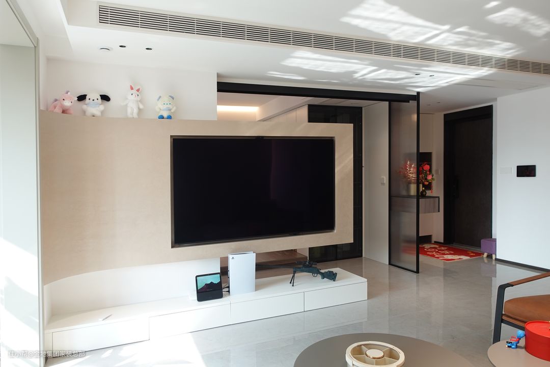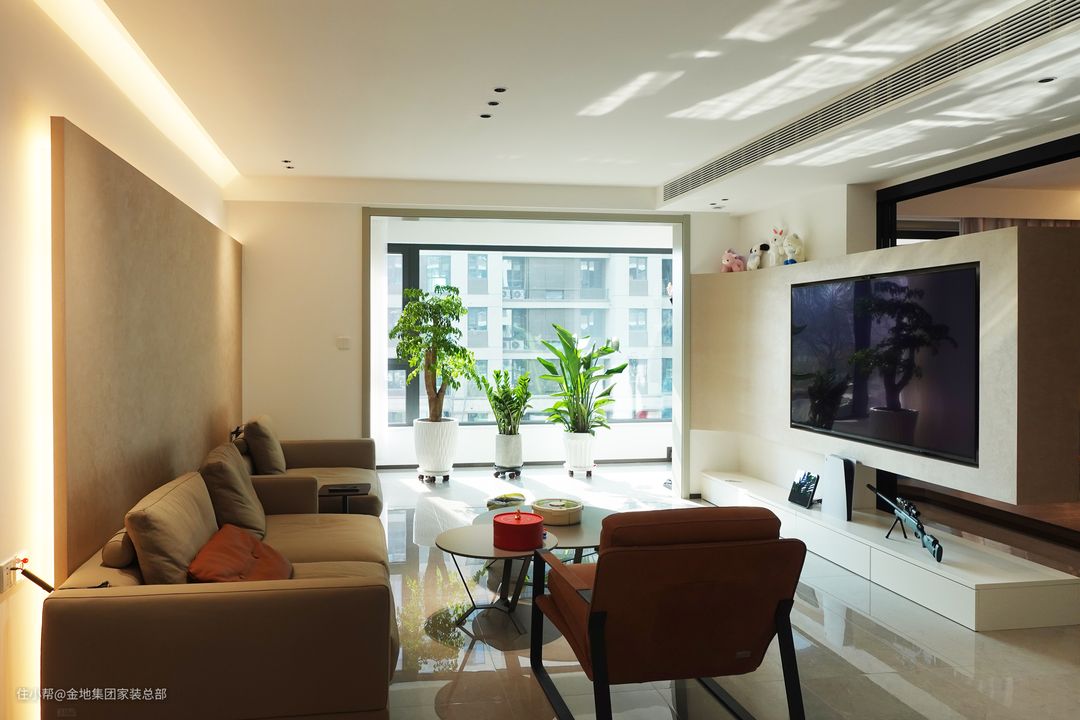 客餐厅一体化设计,贯通阳台,有敞亮的视觉效果和通畅的动线。阳台与客厅相接,作开放式处理,可以让阳光毫无遮挡地撒入客厅,有效解决客厅的采光问题。阳台的绿植盆栽底部安装万向滑轮,移动方便,便于打扫。 暖色调的科技布沙发简单耐看,性价比高,厚软的沙发垫给人云朵般的舒适感。两个沙发用小巧的咖啡色边几隔断,边几既能储物又不占空间,是居家必备的小物件。沙发后的装饰墙颜色稍深,加强整体空间的层次感。浅咖色大理石花纹的背景墙背面暗藏线性灯,柔和的光线倾泻而出,中和了刚硬的直角设计,同时营造出柔和的氛围感。 全屋采用无主灯设计,在吊顶的几个角落安置内嵌筒灯,使房间看上去更加简约。在夜晚时打开筒灯,夫妻两人懒懒窝在沙发上,温暖的灯光烘托出家的氛围。 悬浮电视柜是全屋最独特的设计,电视柜自弧形墙体延伸而出,上下镂空,均可摆放物品,超出墙体的部分作为客厅与储物间的隔断板,半开放的布局从视觉上延展了客厅的宽度,这一别致的悬浮设计让人眼前一亮。