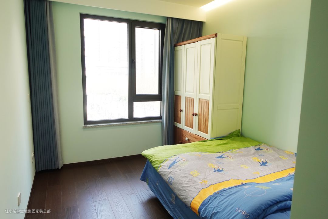 夫妻两人计划在这几年要一个小孩子,因此我们的设计师为他布置了这一间简单的儿童房,因为要考虑到孩子在成长过程中,对房间不同的需求,因此设计出一个“成长型”的空间是设计儿童房的前提基础。 墙体是清新的浅绿色,让人看着就心情舒畅,也有利于保护孩子的眼睛。床头是灰色与蓝色的拼接,简单大方。窗帘为内嵌设计,隐藏不美观的帘头,使房间更有整体感。床脚的柜子是米色与黄棕色的撞色,与客厅沙发的色调类似,整个房间没有太多装饰,以便于日后可以随着孩子的成长调整布置家具和装饰。