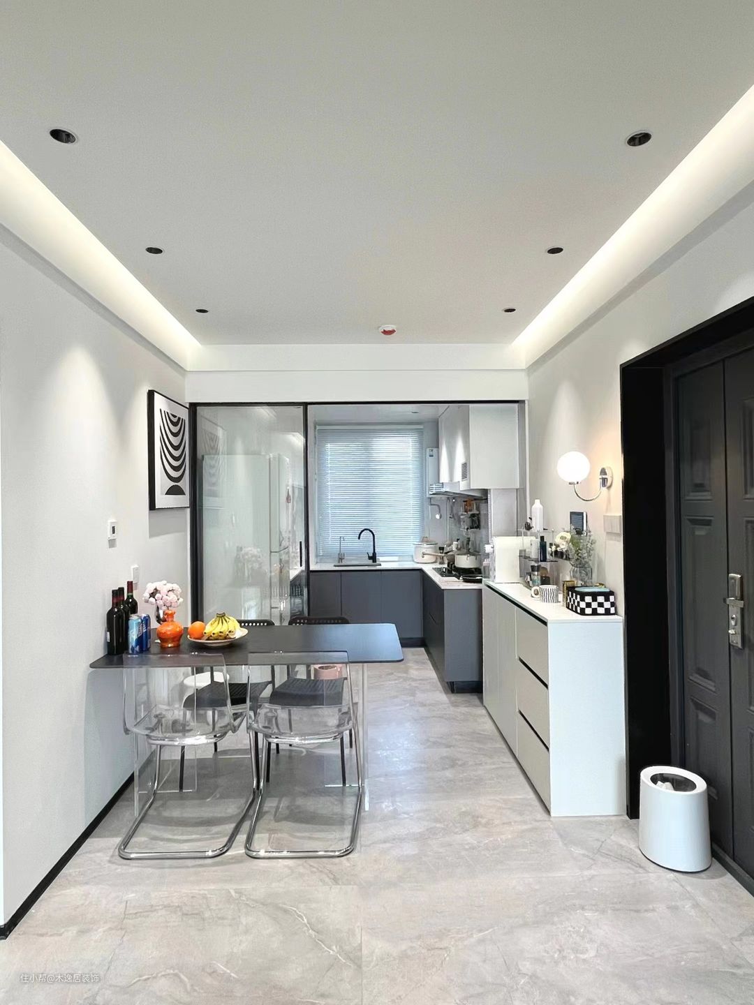 餐厅空间不大,所以选择一米的矮柜,既满足鞋柜收纳又不像传统到顶的鞋柜看上去拥堵