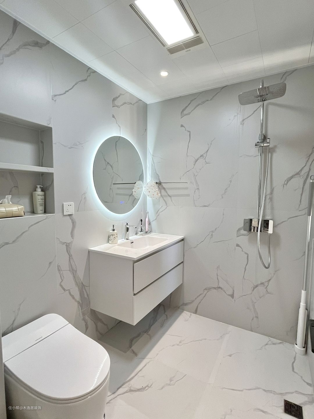卫生间因为采光不太好,选用了永不过时的经典色鱼肚白。正所谓黎明时分,东方泛起了鱼肚白,这颜色须臾万变,灰白之间,彰显出时尚而又不失优雅的质感!