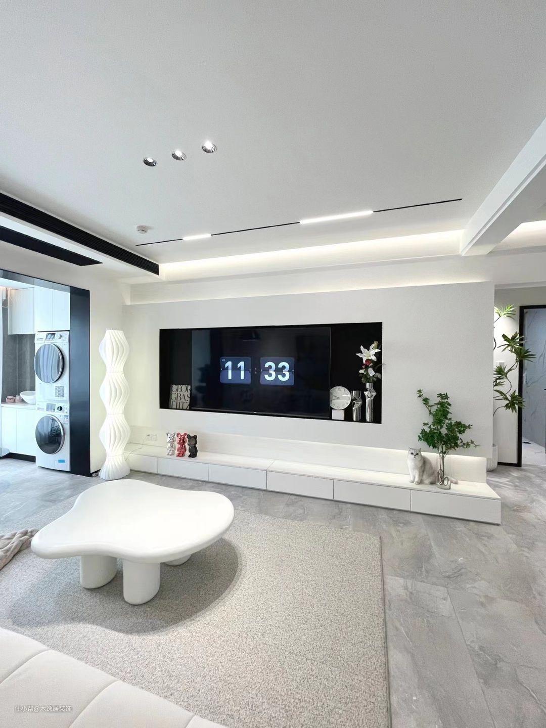 大白墙+大平顶,越简单越耐看。 全屋无主灯的设计,没有选择传统的大吊灯,不用担心灯具藏灰问题以及光源不够,多种光源搭配,家里又高级又有氛围。选择了柔光砖通铺,全屋高级又好打扫卫生。 客厅没有做地台,而是做了地抽,一整个地抽六个大抽屉的设计,既能当摆台又能够收纳,比大理石岩板地台便宜又实用。 电视背景墙越简单越好,电视背景墙是石膏板做的内嵌电视墙,很有设计感,也不占客厅空间。 客厅装的风管机,卧室装挂机,省钱还能达到好看又好用的效果。