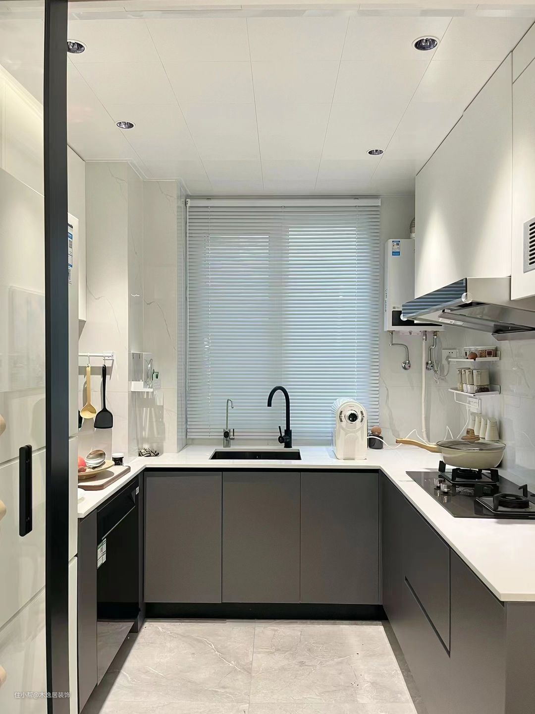 厨房是U型厨房的设计实用性强,空间利用的很好 洗菜区-切菜区-炒菜区,三个功能齐全外观设计也很简洁有高级感 因为空间不大,所以做了半开放式厨房,三联动透明玻璃门不遮挡餐厅视线,推拉门日常开着相当于半开放厨房