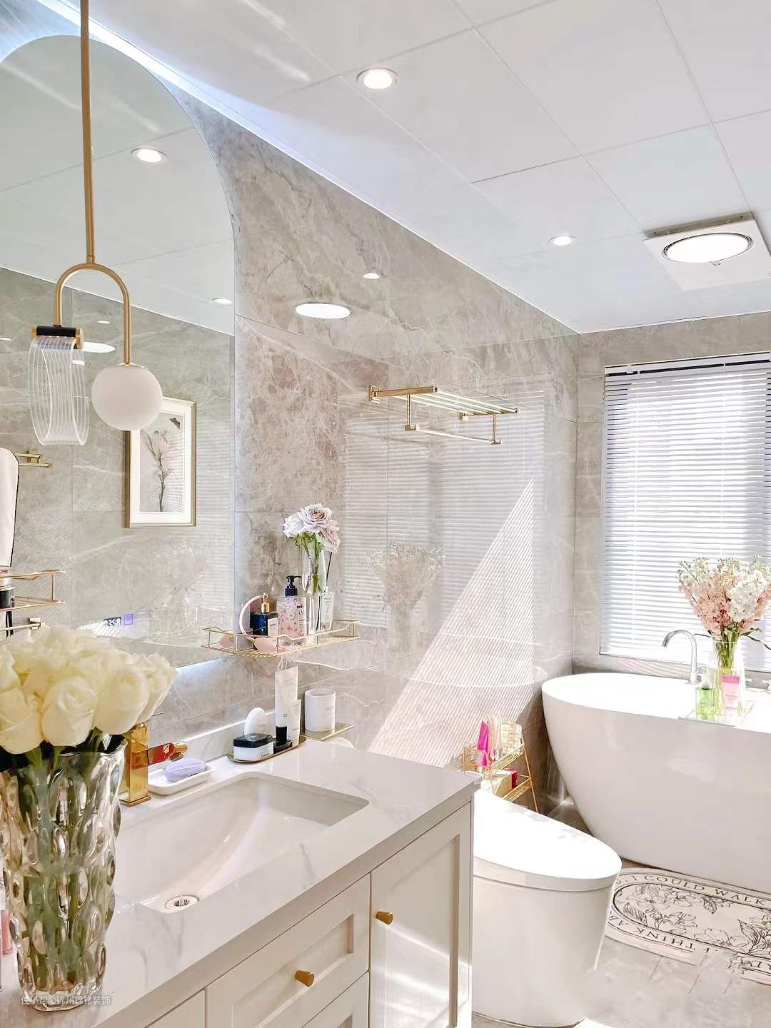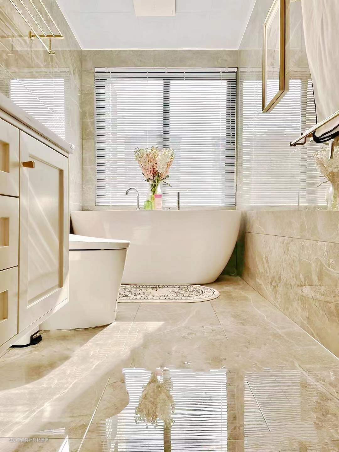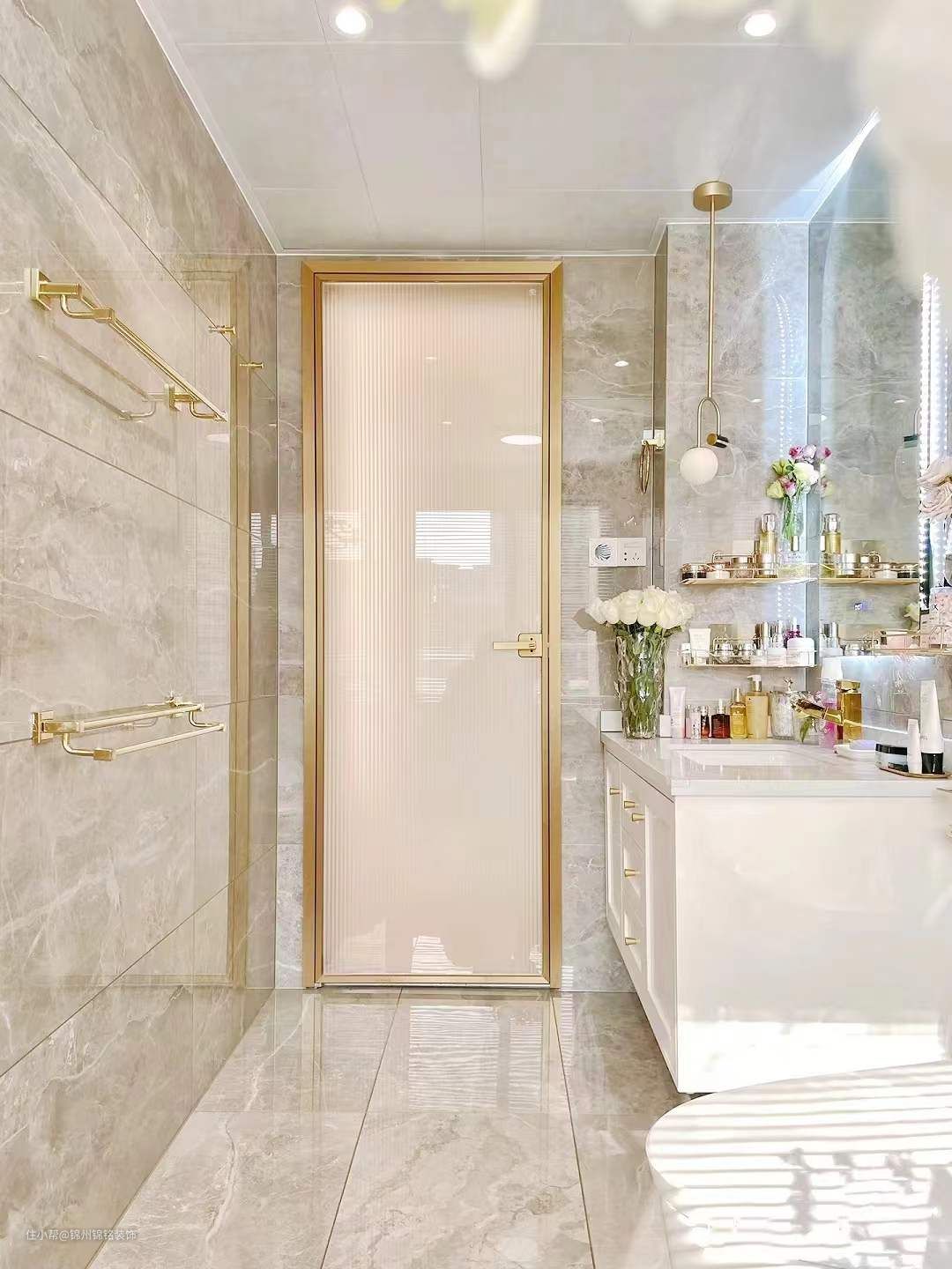 卫生间装修,“天地对缝”铺设闪电灰瓷砖,延伸视觉感。门洞加高到220公分,安装长虹玻璃门。防水射灯增加卫生间光线和氛围感。根据卫生间尺寸定做浴室柜,150公分亚克力独立浴缸。