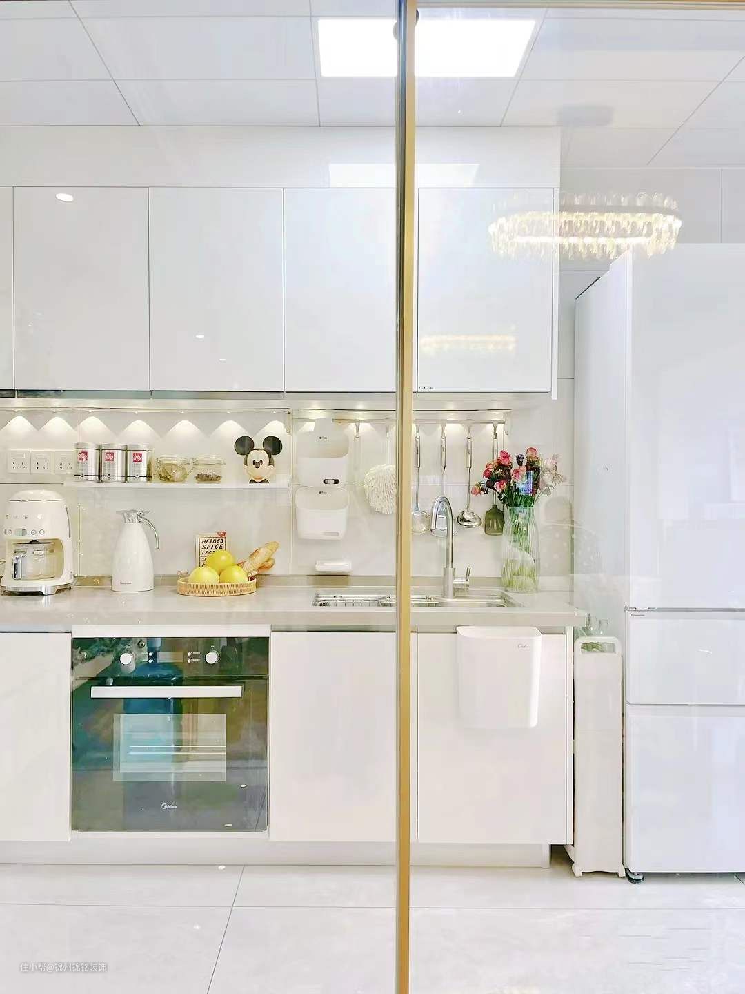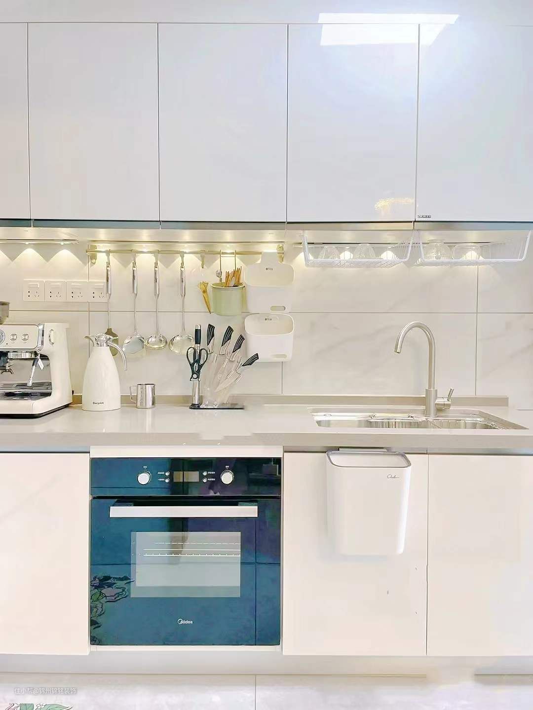 灯光,顶灯为11瓦Led灯,后来觉得光线不够,又在吊柜下方安装了免布线免打孔的Led灯条,USB充电很方便,能够自动人体感应亮灯,漂亮的“小山丘”,瞬间增加厨房的氛围感。