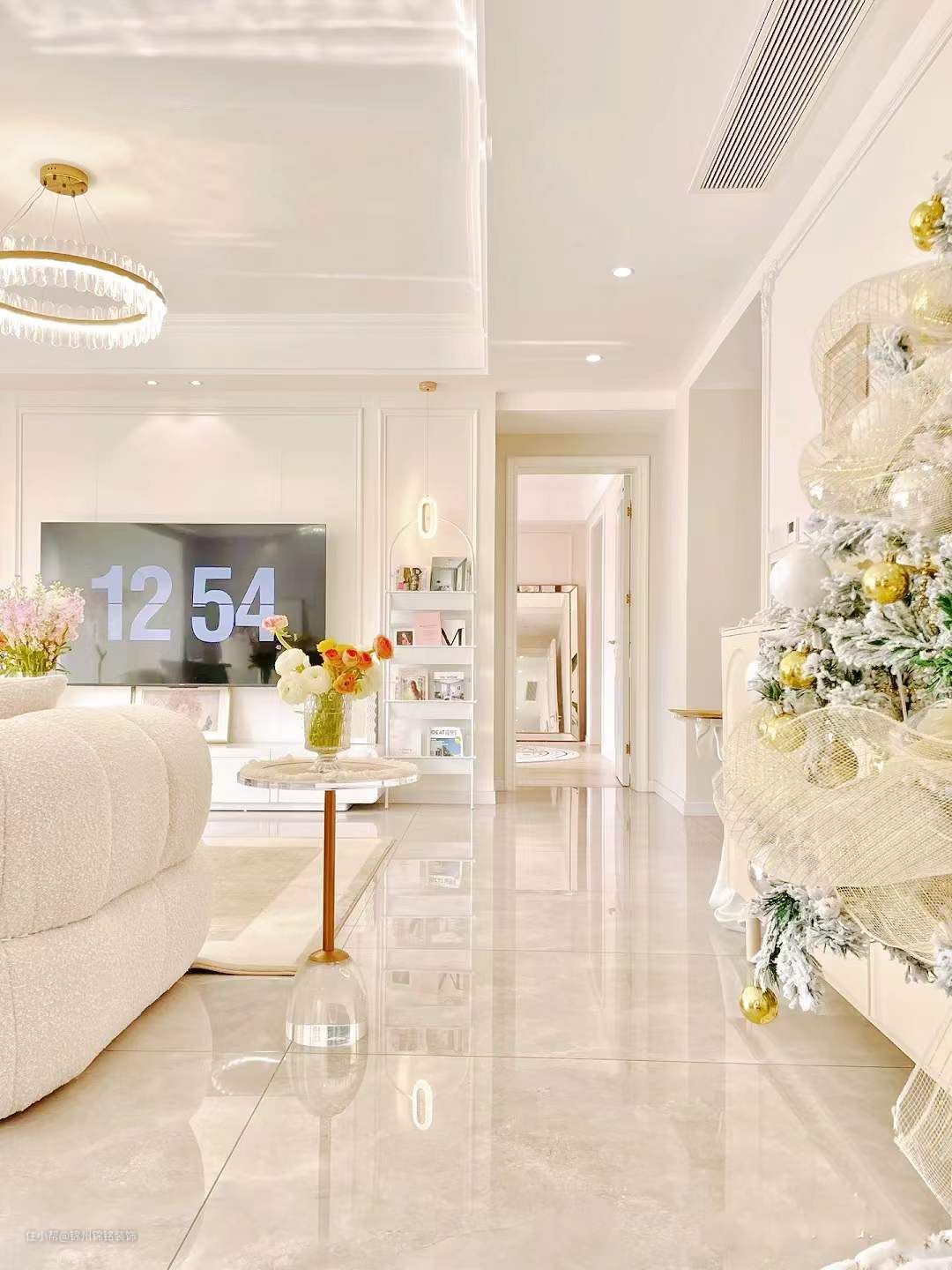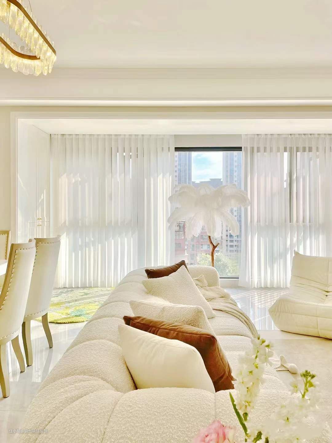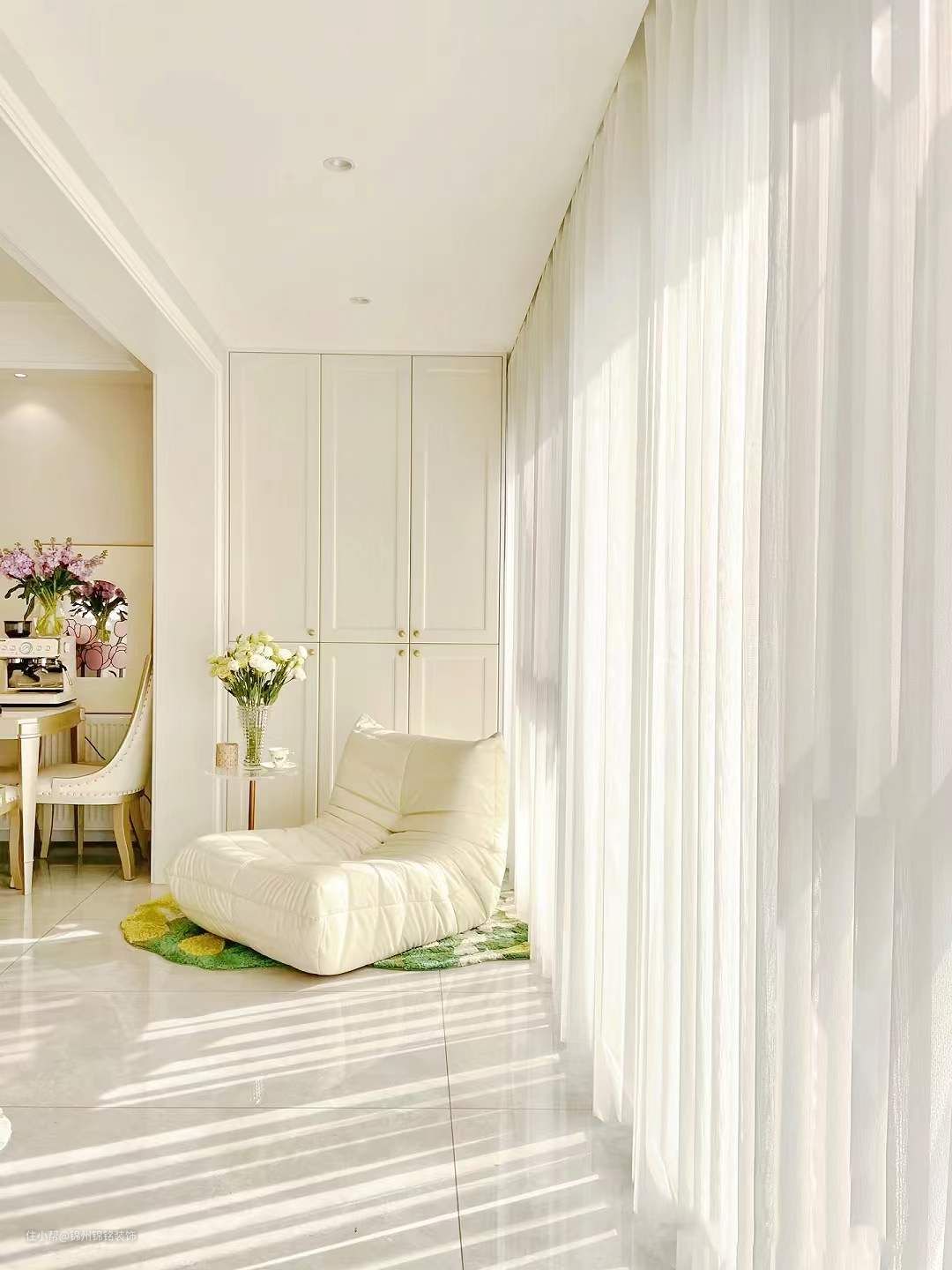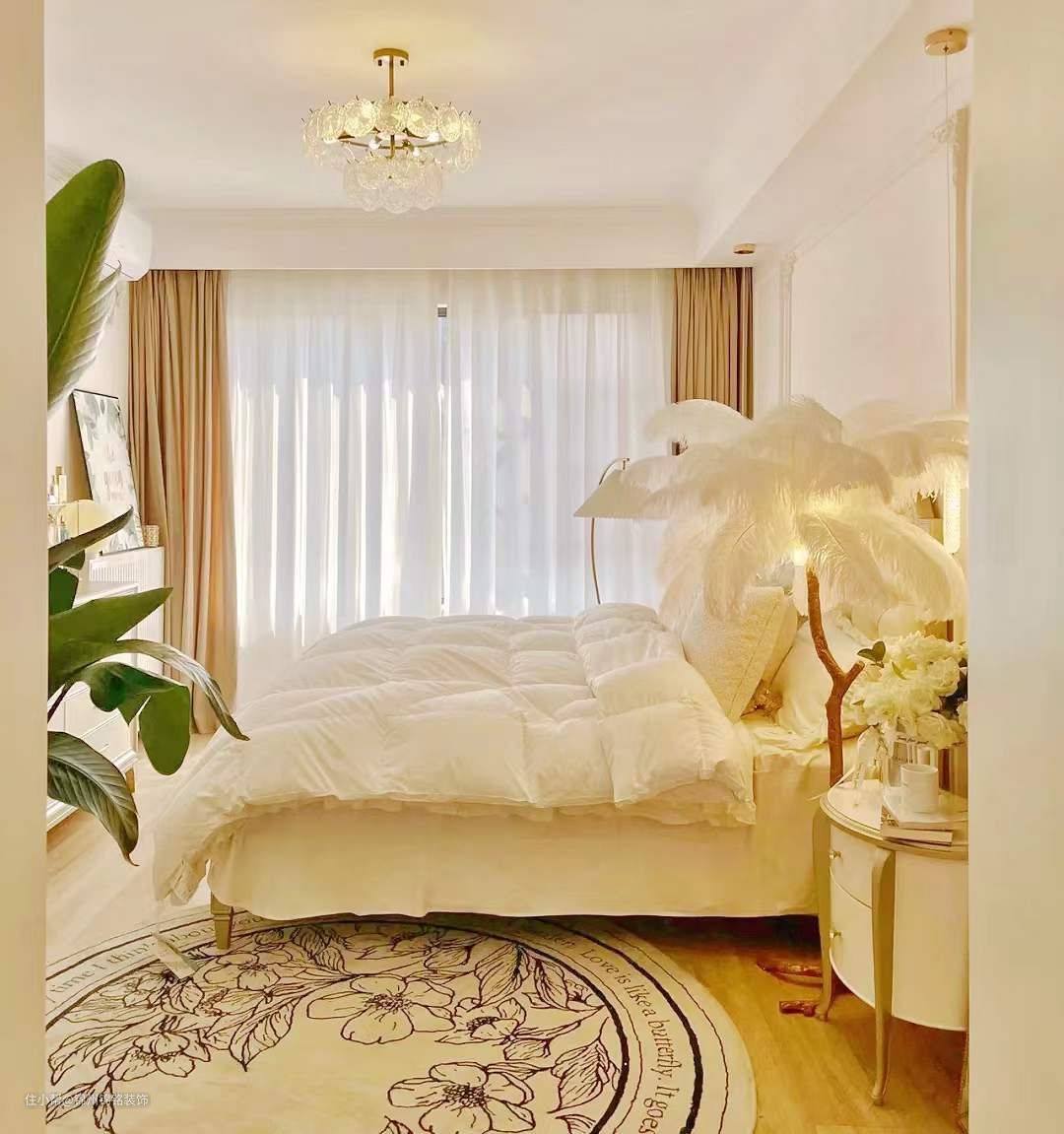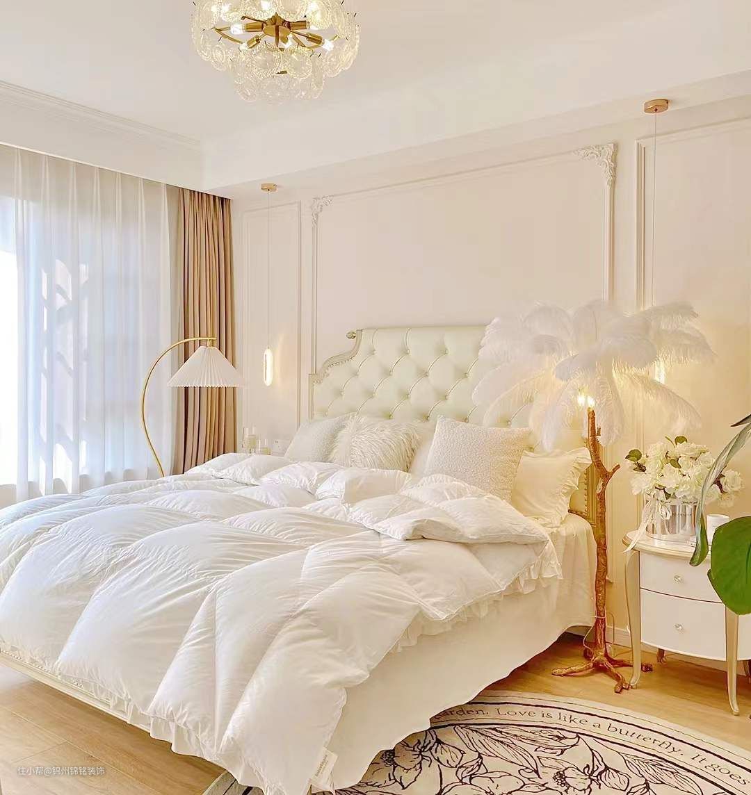 墙面通刷奶油色乳胶漆,实际颜色偏米粉调,房顶为瓷白色乳胶漆。单眼皮吊顶下吊22公分,搭配14公分线条,性价比高,也不压层高。卧室背景墙,4公分石膏线条-30公分角花,有法式轻奢的感觉,低预算好选择画。