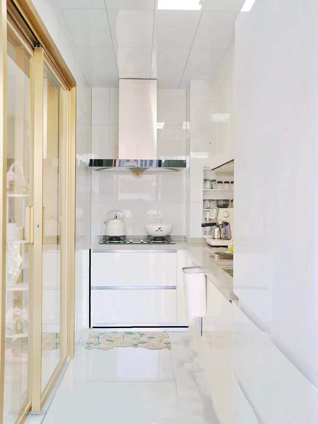 典型L型厨房,为增加视觉延伸感,选择了客餐厅砖150x75公分浅灰色地砖通铺厨房,过门石也由同款地砖代替,同色系月光银美缝。统一鱼肚白80x80公分瓷砖,一分为二铺设,同色系月光银美缝。60x30公分高性价比铝扣板吊顶。