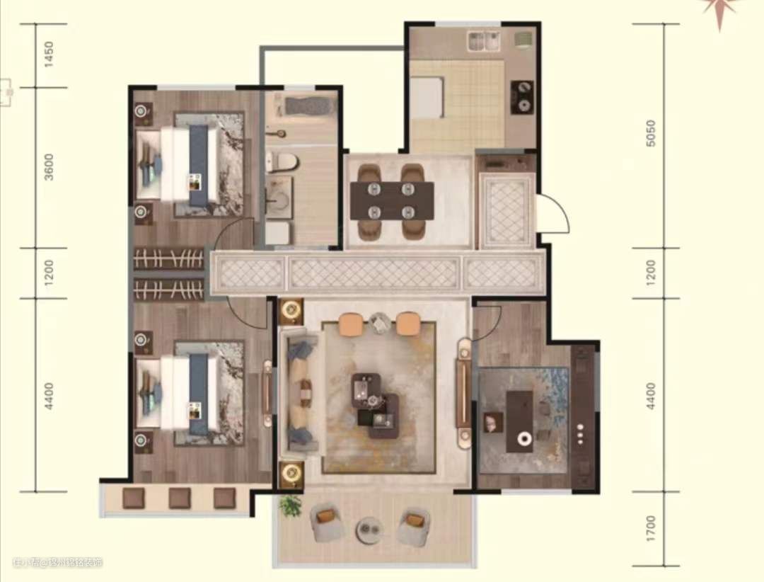 方案解析:常住人口是幸福的一家三口,喜欢法式风。希望家居氛围轻松舒适,温馨浪漫,打造有爱的三口之家。 户型问题: 1.厨房较小;2.收纳较少; 设计思路: 1.客餐一体设计,双眼皮吊顶,不压层高,全屋通刷浅灰色乳胶漆,视觉上更开阔; 2.橱柜、衣柜全屋定制,充分利用空间,白色为主不压抑; 3.卫生间干湿分离,保持空间干燥清爽。
