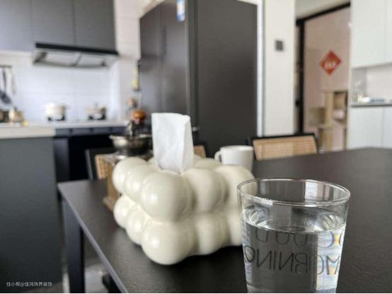 藤编餐椅与时尚单椅,一高一低,打破呆板印象,体现对称的独特美感,分置于餐桌两旁,协同编织自然惬意的用餐气氛。 餐桌和纸巾盒选择则倾向于不同否认直线和曲线外观造型,柔润而不失灵动,适时摆放上充满仪式感的餐具,便成为空间里最鲜活的存在。一杯一饮皆是生活。