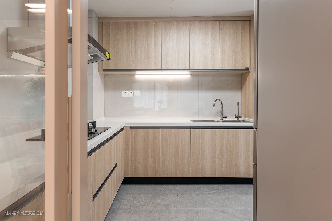 餐厨之间设计师选用了透光性好的玻璃门做隔断,避免油烟污染,也最大程度上保证了空间的采光通透。 考虑到打扫卫生的问题,所以设计师就在厨房地面铺贴了灰色地砖,耐脏耐看好清理。跟墙面上方的白色瓷砖又做了适当的反差对比,增添空间的层次感。 L型的橱柜布局,将空间最大化利用起来,足够的操作区域,就是家里人多一起做饭都不会拥挤。