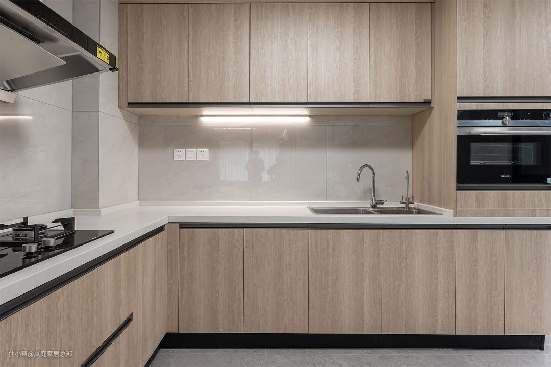 从另一个角度来看,在一侧的墙面上方还做了吊柜增加收纳,将空间有效利用空间。柜体无把手的设计,美观又实用,还不易磕碰。 将蒸烤箱等电器嵌入橱柜,不会因为单独摆放而显得杂乱,事先决定好要装的电器,再根据电器的预留出合适的尺寸来,才能做到和谐统一。 考虑到厨房的功能性,所以吊顶就做了铝扣板设计,防潮防水更耐用,适合厨卫这样的空间。