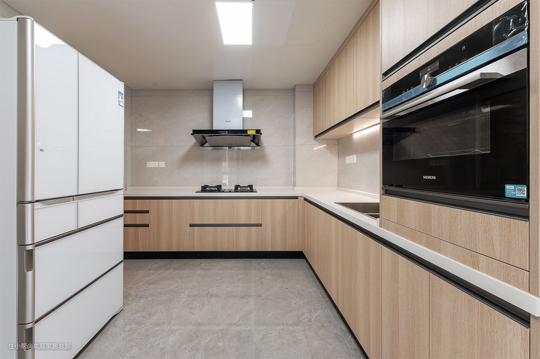 餐厨是经典的竖厅布局,入户就是餐厨,可以看到餐厅一侧的背景墙还延续了玄关的木饰面背景墙,天然的原木材质给空间带来了独一无二的温馨质感。