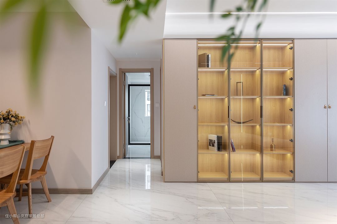 入户的玄关做了定制的嵌入式设计,一柜到顶鞋柜,中间和下方留空,方便放鞋储物,无卫生死角。中间留空的部分还预留了插座,充些小电器都是可以的。 简洁白色的柜门,一进家门就奠定了极简原木风的基础。搭配上精致小巧的门把手,设计师特意选择了不同寻常的皮革做门把手,有新意又好看,实用性一点也不差。