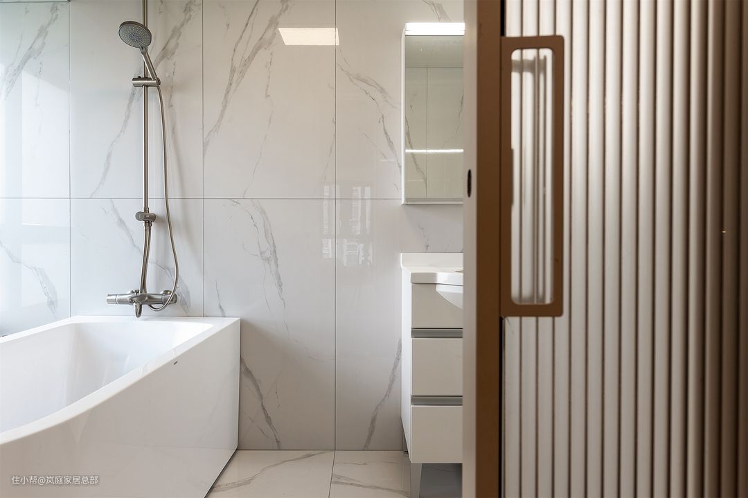 主卫面积较大,设计师还安装了浴缸,所以选择舍弃了干湿分离,三角布局的形式,节省空间不拥挤,动线也合理。 公卫则是经典一字型的布局,淋浴区用了玻璃门做隔断,确保做到干湿分离。卫生间都是通铺的白色一体式的瓷砖,简单大气不过时,加上充足的采光让空间更加开阔明亮,更显宽敞大气。