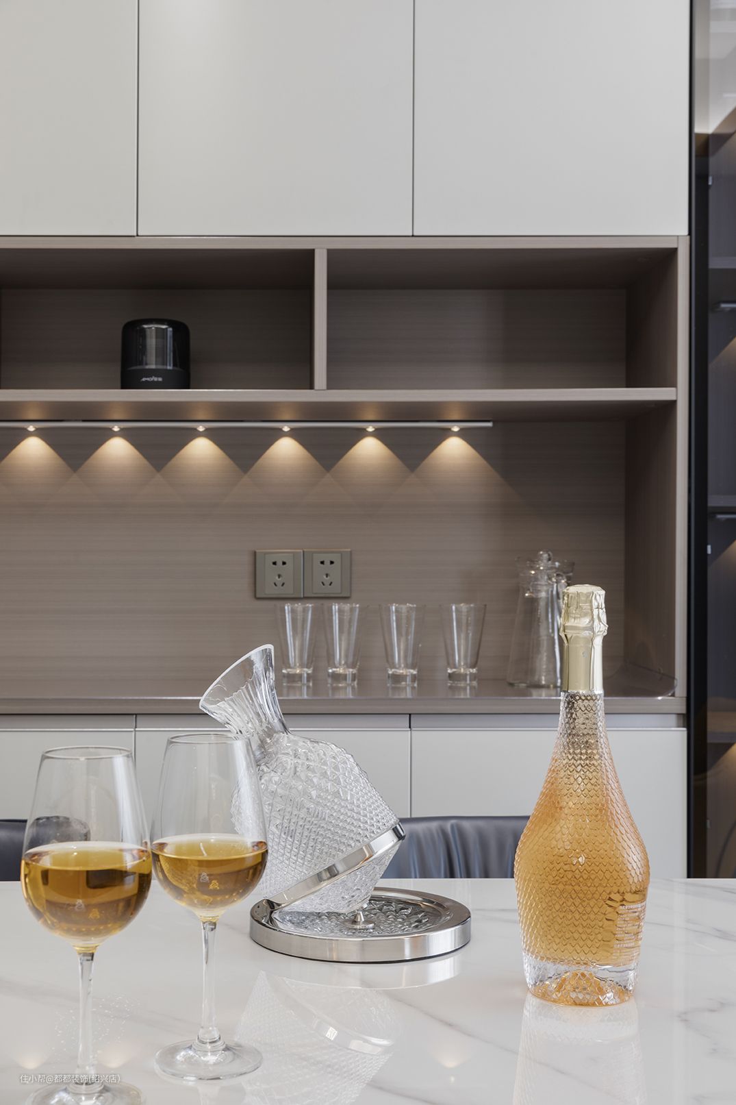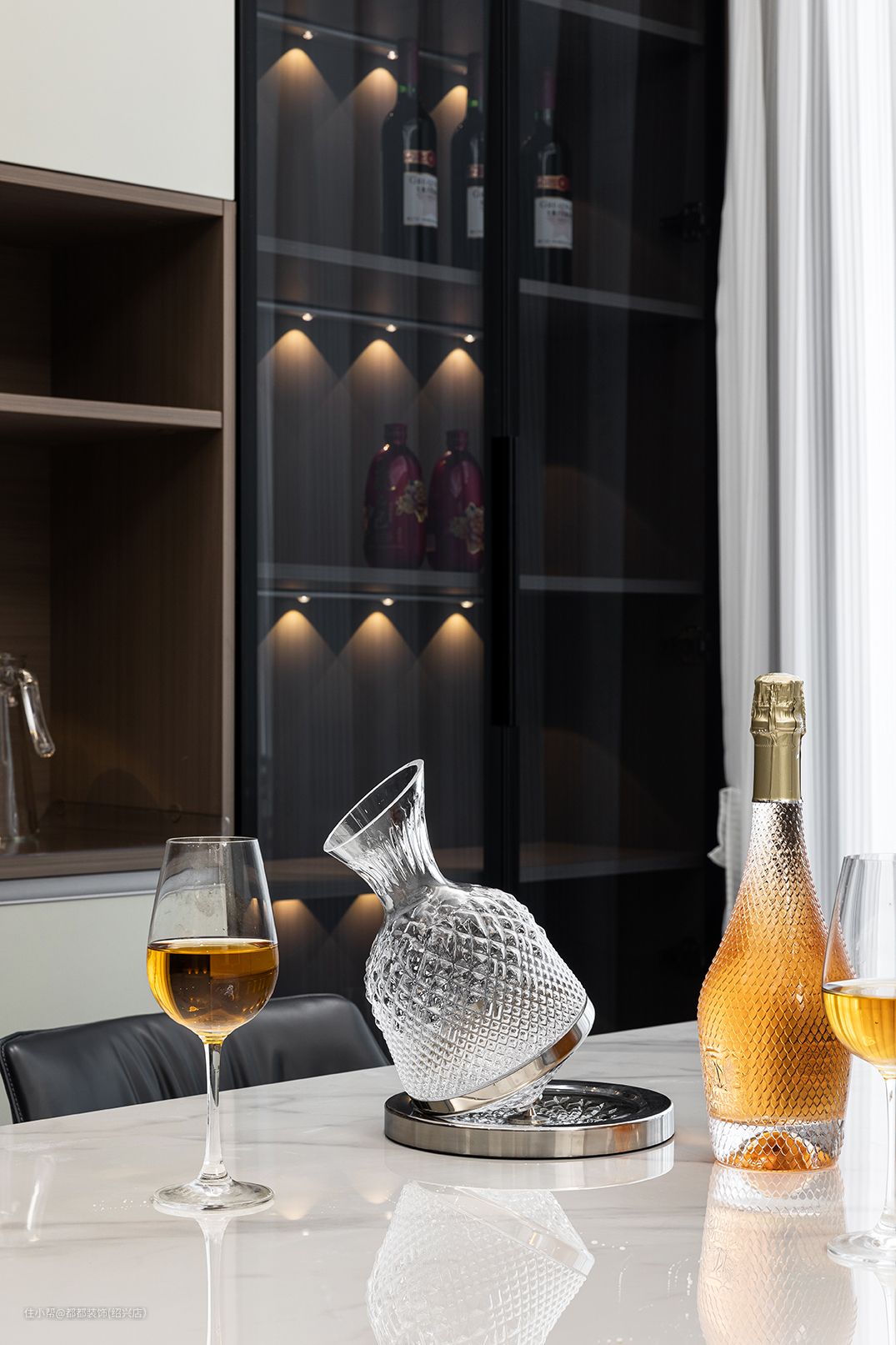 餐厅后面特意做了一整墙的展示柜和餐边柜,白色柜面恰到好处的留白,温暖灯带搭配随着光影若隐若现的朦胧黑色玻璃,呈现出一派简约的摩登情调,干净整洁又不失雅致。