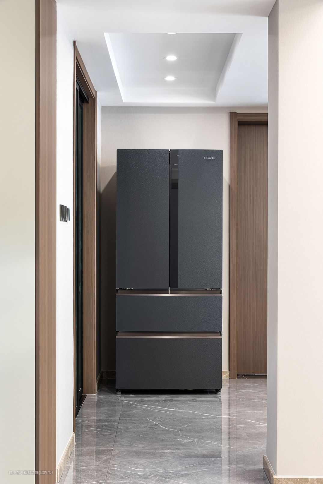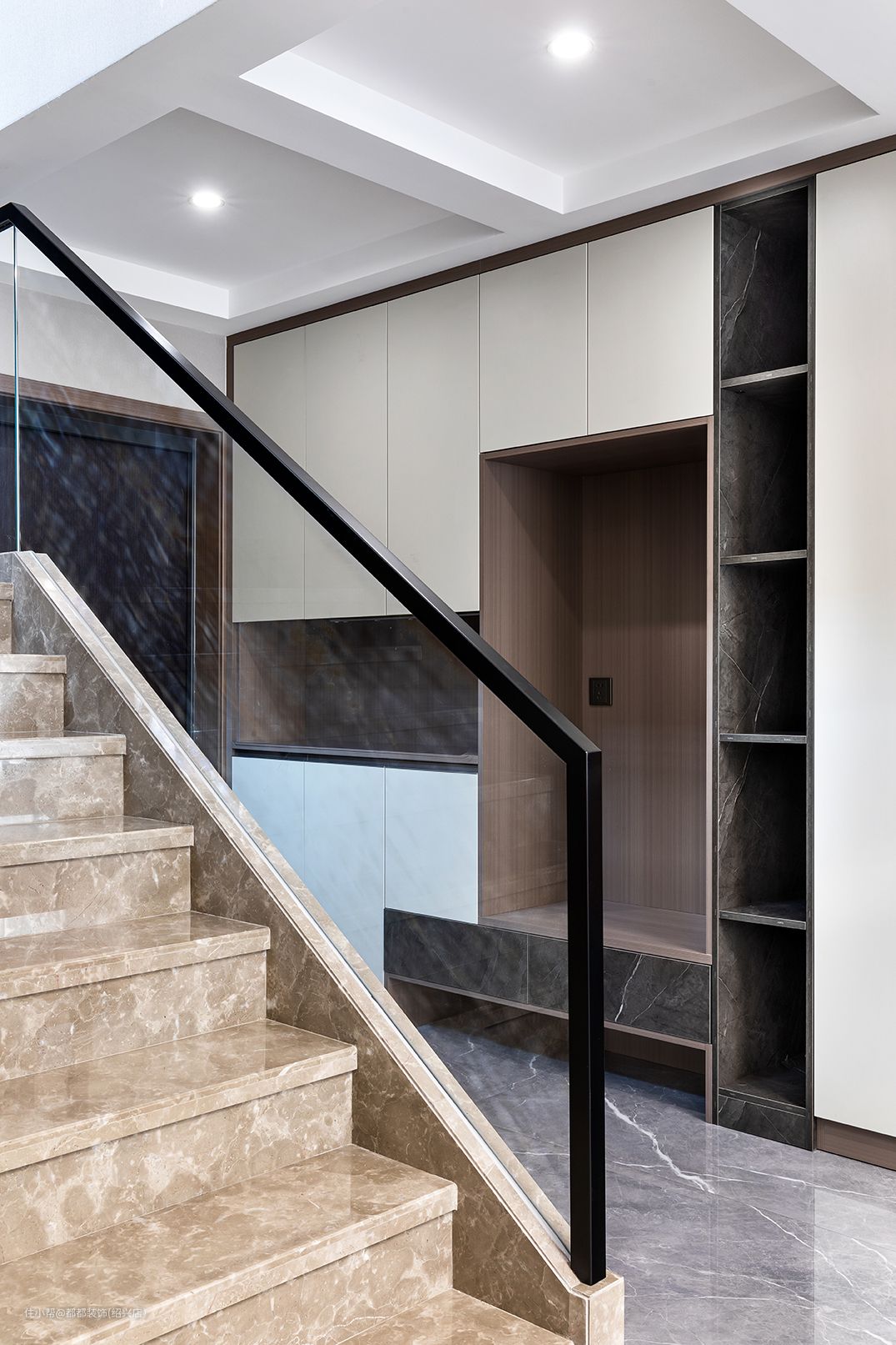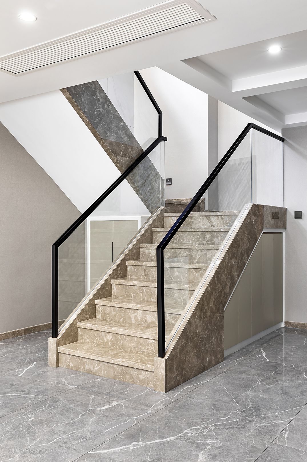 对于家里是跃层户型的屋主来说,楼梯处空间是一定不能浪费的,楼梯下方的空间用来做储物室收纳,可以来摆放一些鞋子、零碎杂物等,轻松多出5个平方的空间,玻璃面扶手增加通透感,浅咖大理石台面给人一种步步生莲的美感。