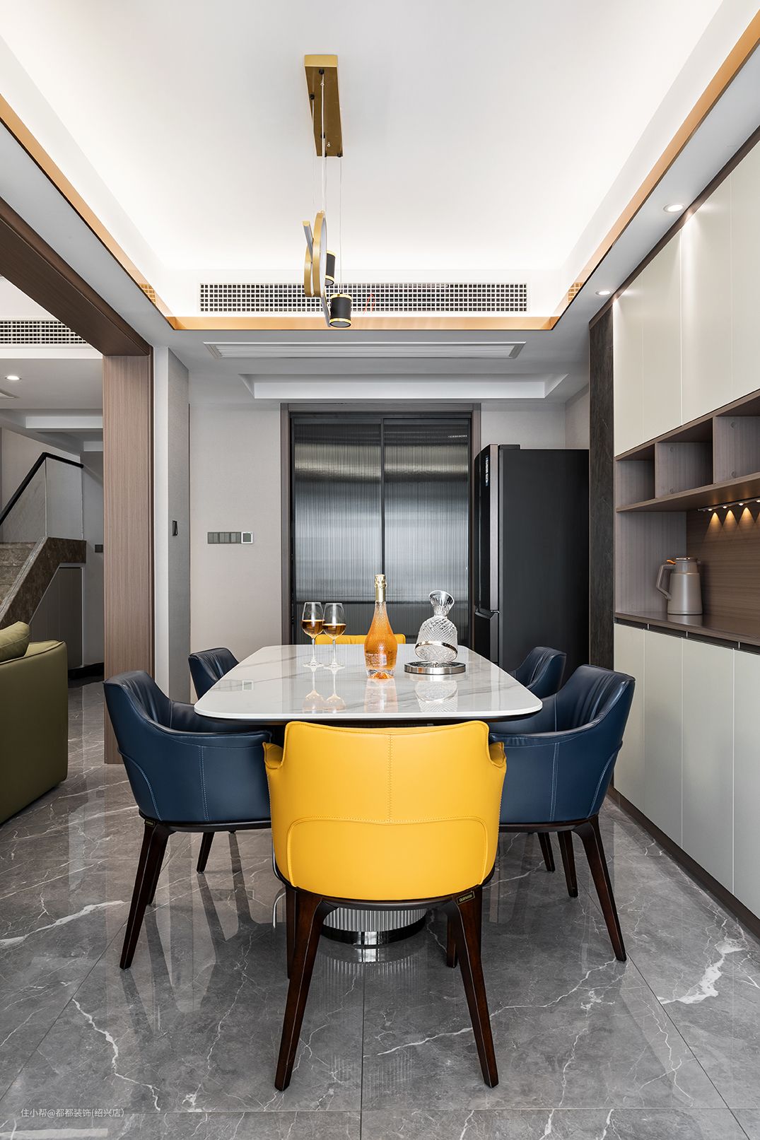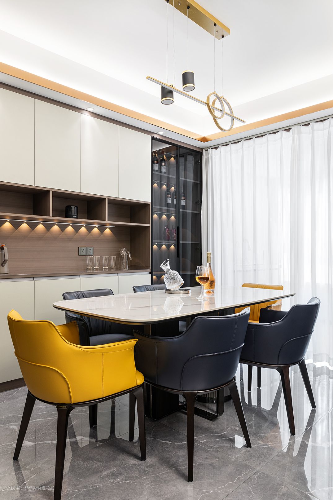 餐厅的主家具也都充满了现代轻奢的风韵,大理石台面与设计感十足的桌腿交相辉映,相得益彰,软皮的餐椅温馨优雅,而跳跃的亮黄色则为整个空间增添了些许层次感与浪漫情调,是趣味的碰撞与流动。