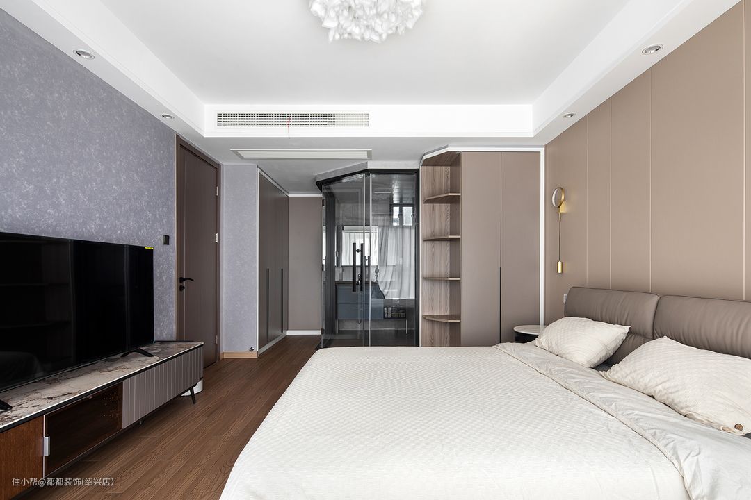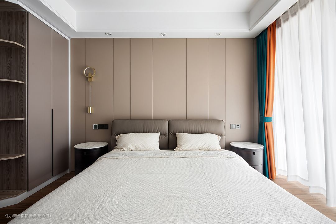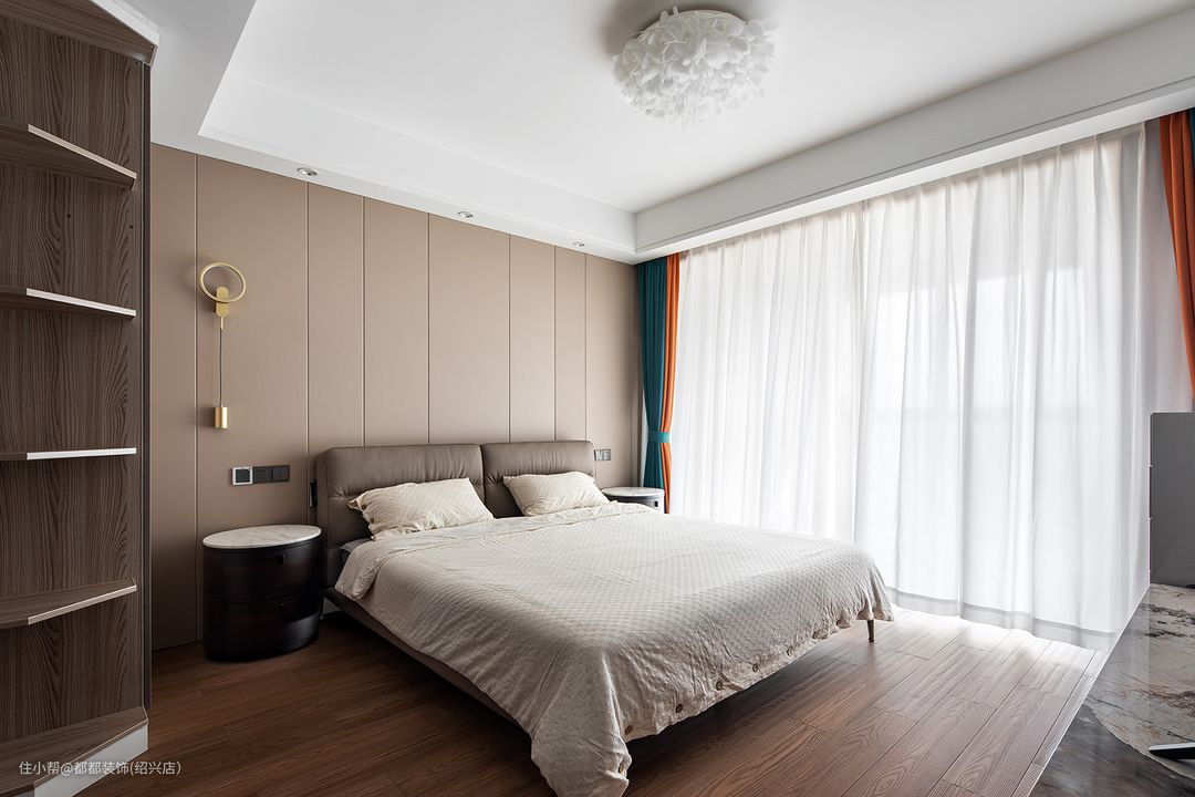 主卧作为使用时间最久的场所,舒适度尤为主要,背景墙采用木质护墙,搭配双眼皮顶面设计与羽毛灯的结合,素雅的白色使得空间更具质感,落地窗给室内空间带来足够的自然采光,还提高了卧室的休闲性质。