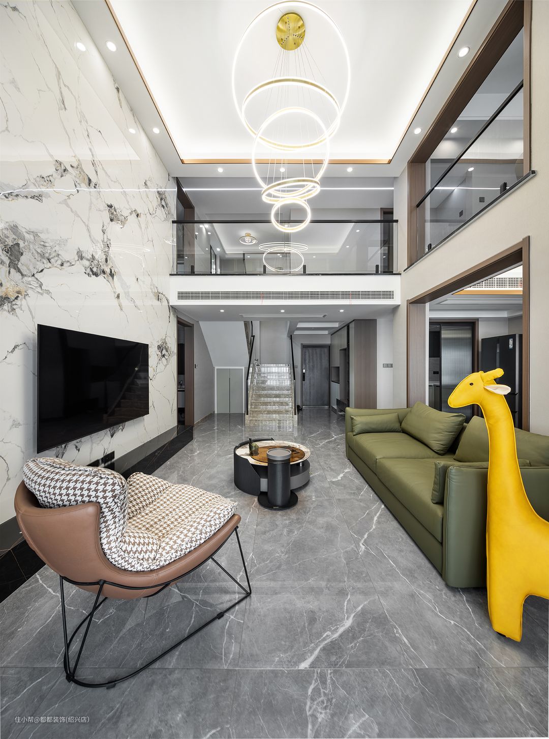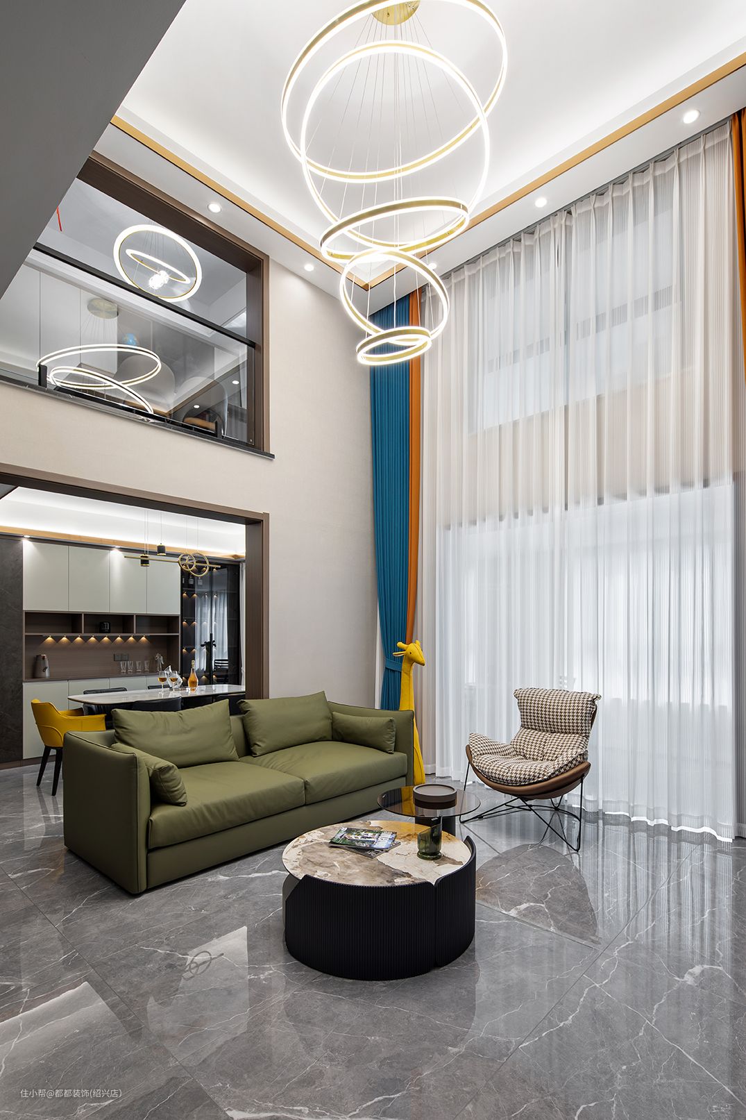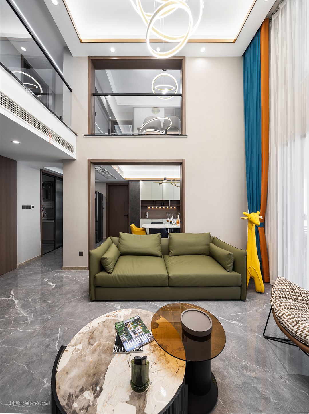 客厅是中间挑空的跃层结构,上下双层的优势让家的改造空间无限大,简洁内敛的空间基调让屋主归家后的心情也焕然新,白色为主体颜色,干净、整洁之感安然呈现;超大的层高给人带来广阔的视觉冲击感。