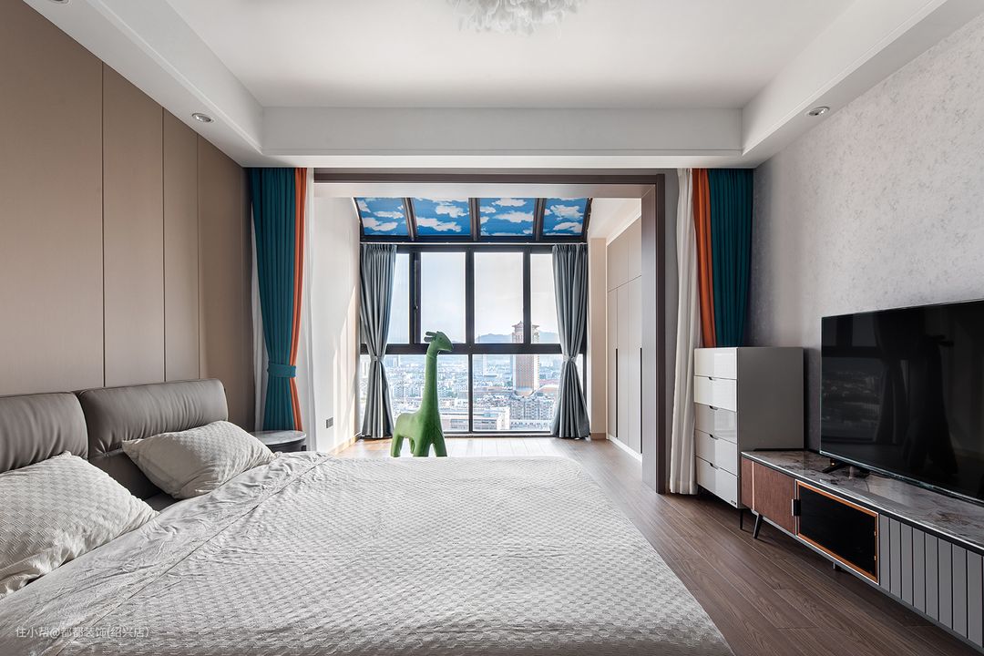 阳台处还增加了衣柜空间,再铺设以木饰面,多个柜面并列通体是质朴木色,构造简洁却存在感颇强,阳台顶是蓝天白云的图案设计弱化了空间内的冷硬色彩,打造出柔和自然的空间感。