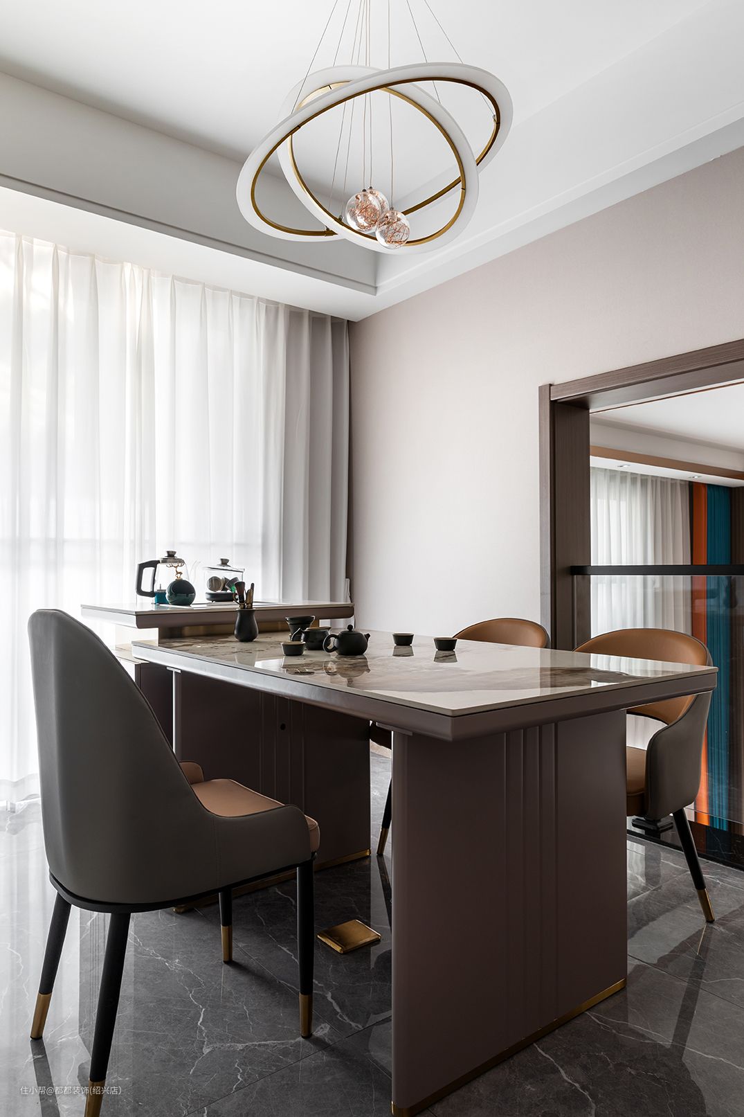 业主将喝茶文化融入日常,打造了一处两面采光的茶室,茶室整体依旧为现代风格,大理石桌面保留自然纹路,提供平整光滑的触感,靠墙定制收纳柜放置茶具用品等,美观精致;热水滚烫,茶叶翻滚,杯声轻碰,坐拥古雅,亲友谈天说地,偷得浮生半日闲。