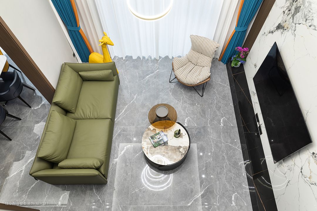 电视背景墙通过色调柔润的咖色木格栅,来调和整面大理石墙的坚硬质感,3500k色温的曲线灯带让空间有了温度,再加以橙蓝颜色的窗帘点亮空间,使空间更加活泼灵动。