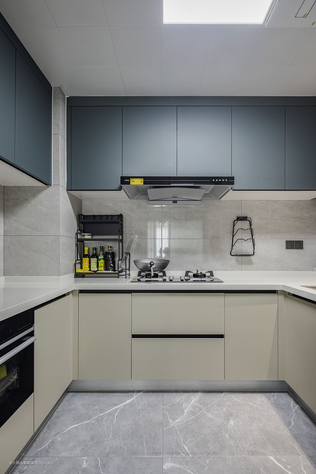 将原来的厨房空间外扩,形成U型布局的厨房,侧边窗户和方形灯具让采光性极佳,放眼放去整体布局紧凑有序,采用上下双层柜体增强收纳空间,白色系的橱柜显得轻盈而整洁,把冰箱放在厨房外侧,这让厨房的每一寸面积都得到了合理利用。
