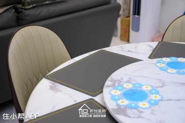 餐厅区域位置布局合理,表现在使在餐厅用餐时,依旧可以享受到电视娱乐,空间娱乐体验感上升,且连接阳台,自然采光让餐厅空间更加敞亮。 中式风空间设计在线条的运用也是非常讲究的,餐厅圆形吊顶与客厅方形吊顶的细节处理,搭配双层吊灯的奢华,宛如举止文雅的大家闺秀。 到顶餐边柜做嵌入墙体设计,实现规整的视觉效果,让空间没有多余的凹凸感,尤其是四门大冰箱的完美嵌入,更加考量了设计师对尺寸的掌控能力,空间高级感瞬间凸显。 偏咖色的柜体突显木质肌理,搭配玻璃门收纳层,既有收纳的隐蔽性能又有收纳的展示性能,既呼应了中式风的自然,又点缀了新中式的创新。使用金色线条与把手点亮整体,更是彰显文雅之风,餐厅用餐同样能感受到文化的韵味。 环绕一圈,厨房、儿童房、楼梯间清晰可见,舒服的采光、安逸的层高,保障了日常生活的舒心,双层中空玻璃推拉门将厨房餐厅各自独立,避免了厨房油烟渗入餐厅,又可透过玻璃门进行烹饪、用餐互动,更加体现了设计师的细节处理,生活幸福感瞬间提升。 撞色皮质椅子搭配双层花纹岩质转动桌,提升了整个餐厅的高级感,转动桌子不仅贴合了屋主的多人用餐的便利体验,还体现了设计感,非常适合招待客人或人多的家庭,生活体验更加便捷。