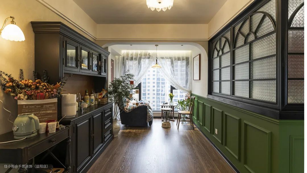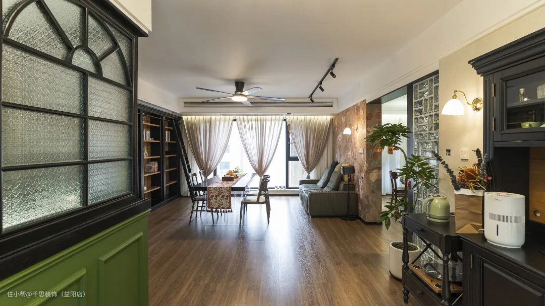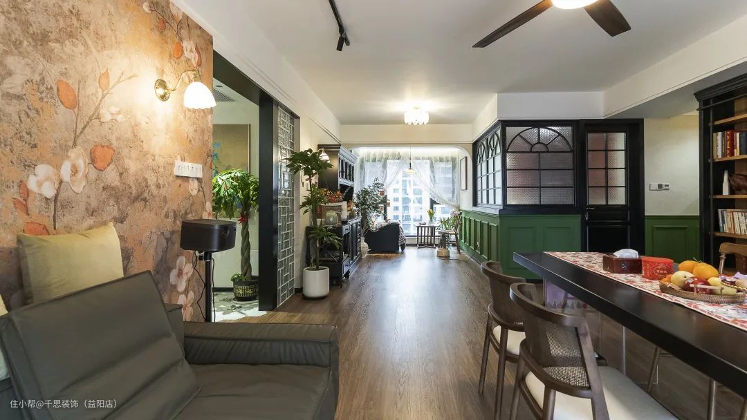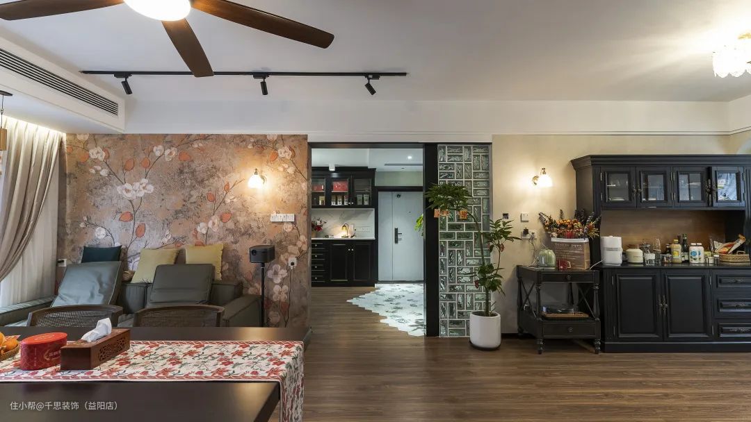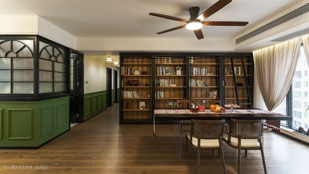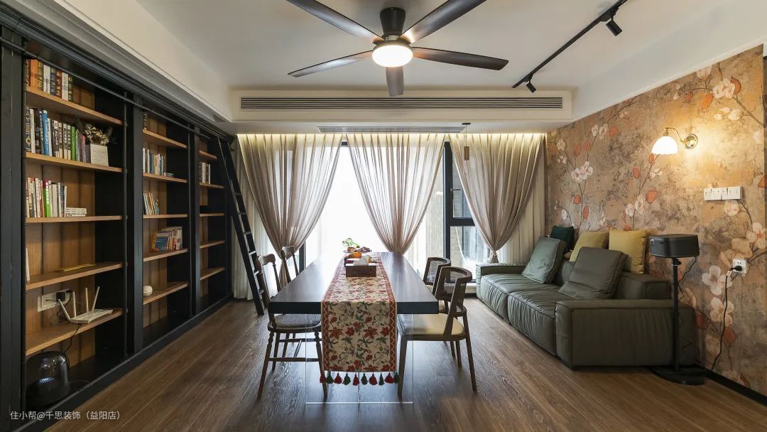 整个客厅区域一分为二,一边为阅读休闲区,可邀三五好友谈天品茗;一边为景观阳台区,安置复古斗柜、绿植,多了几分岁月感。南洋复古风的魅力在于自由个性,打破传统的空间布局。定制一整排书架,黑色与木色混搭,古朴大气,于上方做了隐藏式投影仪。