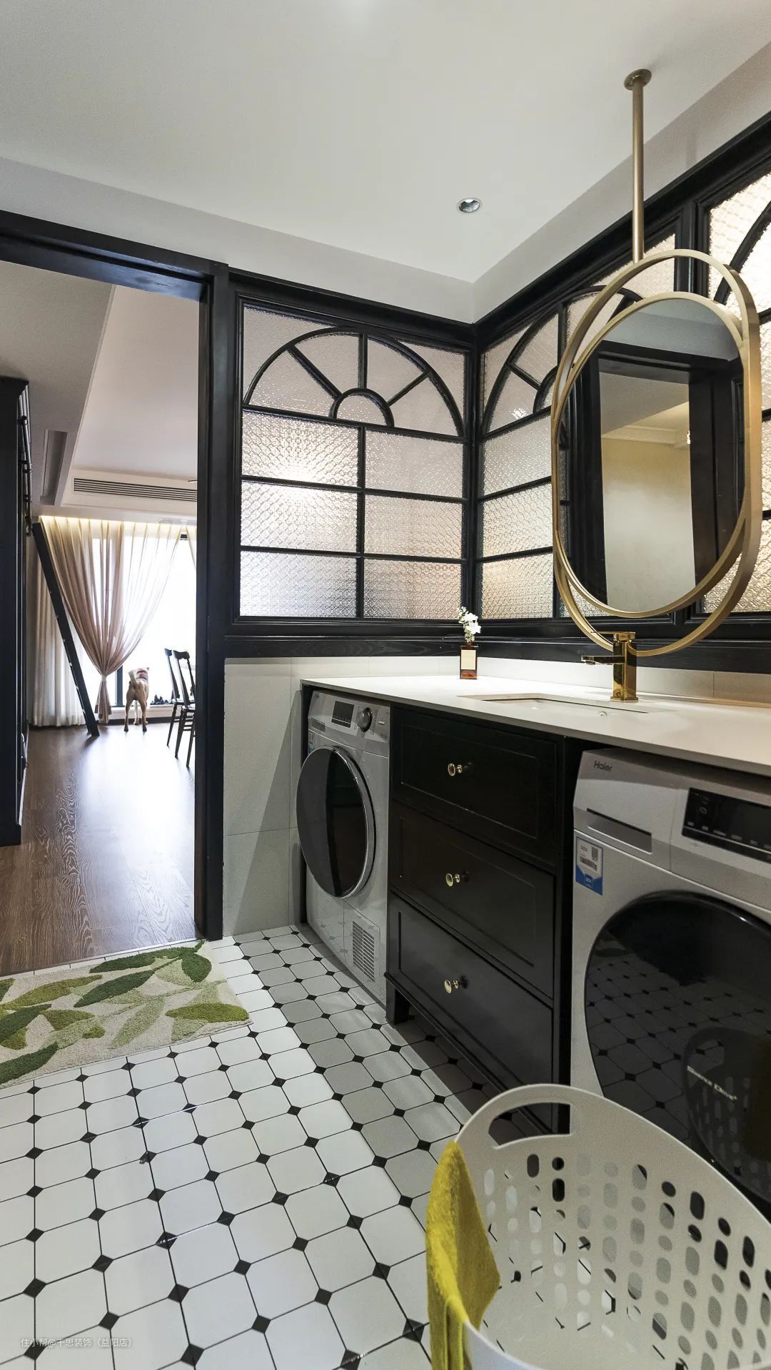 改造后:于入户门对面,安置一组玻璃墙,有效阻隔视线。改变厨房入门位置,餐厨动线缩短。次卫空间拓展,嵌入烘洗设备,减少面积浪费。衣帽间改变入口,直接与主卧连通。