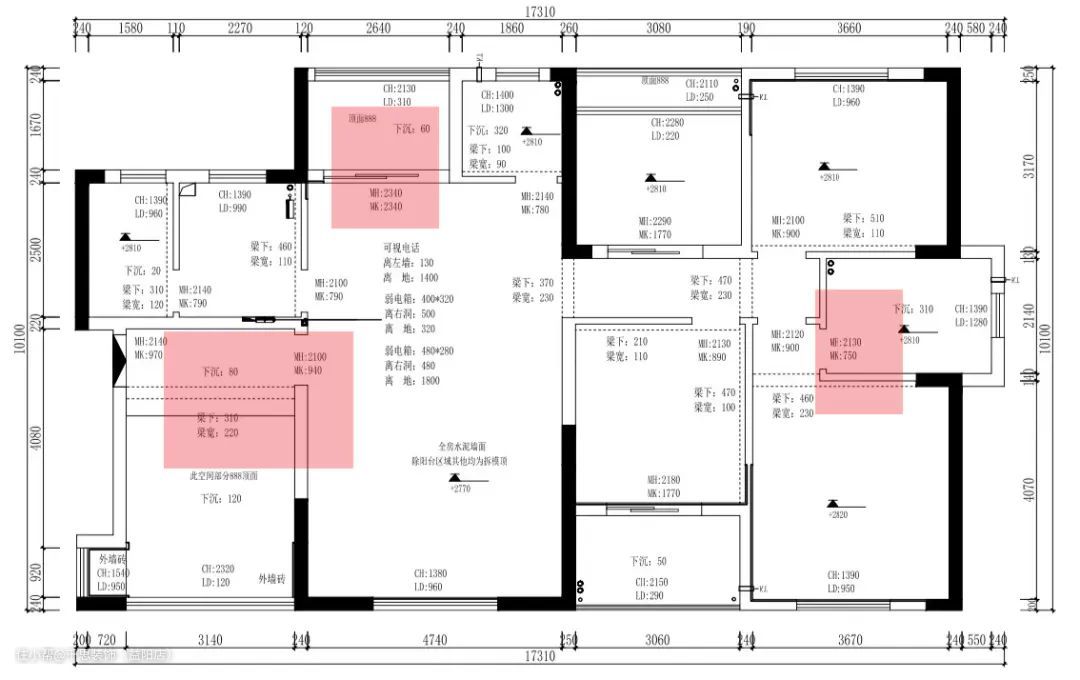 原始户型:建筑面积160㎡,设四居室。户型方正,南北通透,全明卫,采光性佳。但玄关入户见厅,无遮挡。主卧与衣帽间无法直通,动线不合理。公区存在着少量面积浪费。