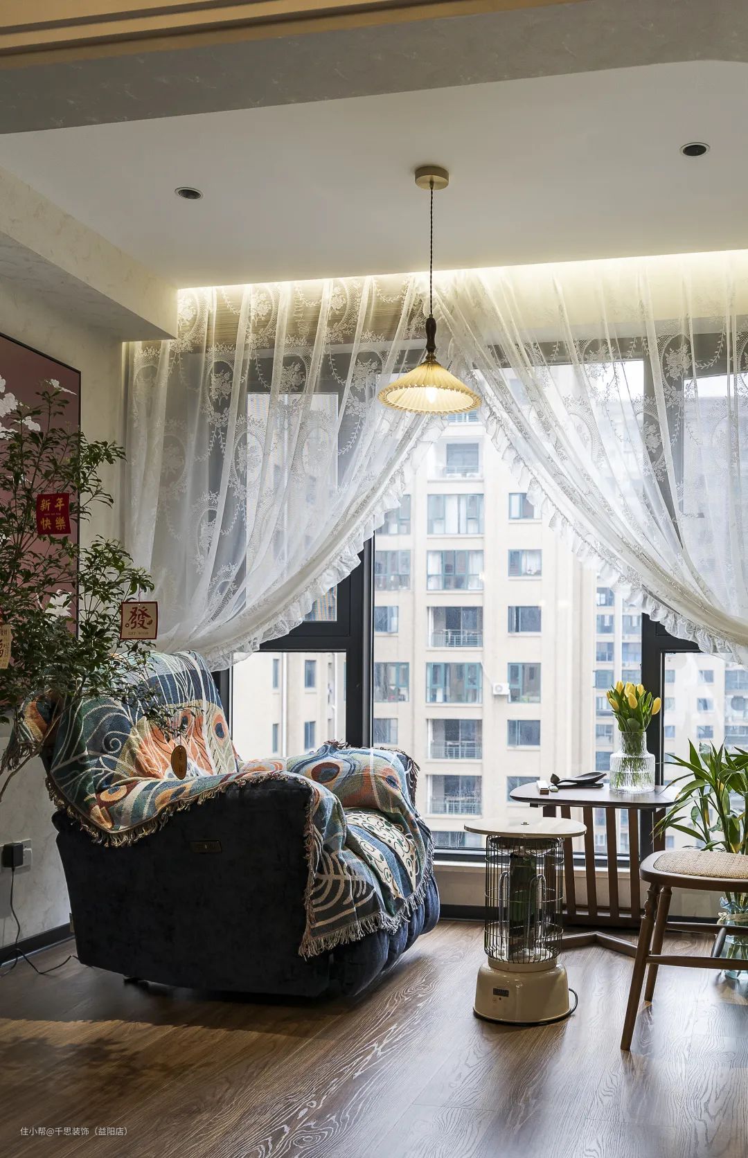 靠墙摆放躺椅+茶几,成为休憩一角。软装上,波西比亚风的沙发罩、藤编元素的椅子、中式花鸟挂画,无一不在彰显南洋复古情。
