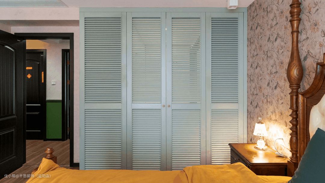 空间以焦糖色+奶白+黄绿色三色组成。胡桃色的床头柜,在昏黄的暖光下,别有一番老电影风。一张单椅,专属屋主的私有浪漫。改变原衣帽间入口方向,并以薄荷绿的百叶门与主卧连通,有效缩短动线。推门进入,即是L型衣帽间与主卫,设唱功玻璃门隔断。