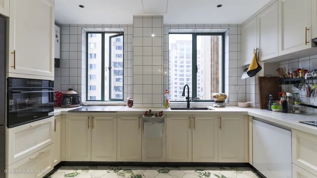 厨房设计,以操作合理、收纳便利为核心。利用左侧橱柜打造U型布局,洗剪切区靠双窗而设,保持开阔明亮的使用感,清爽简洁。