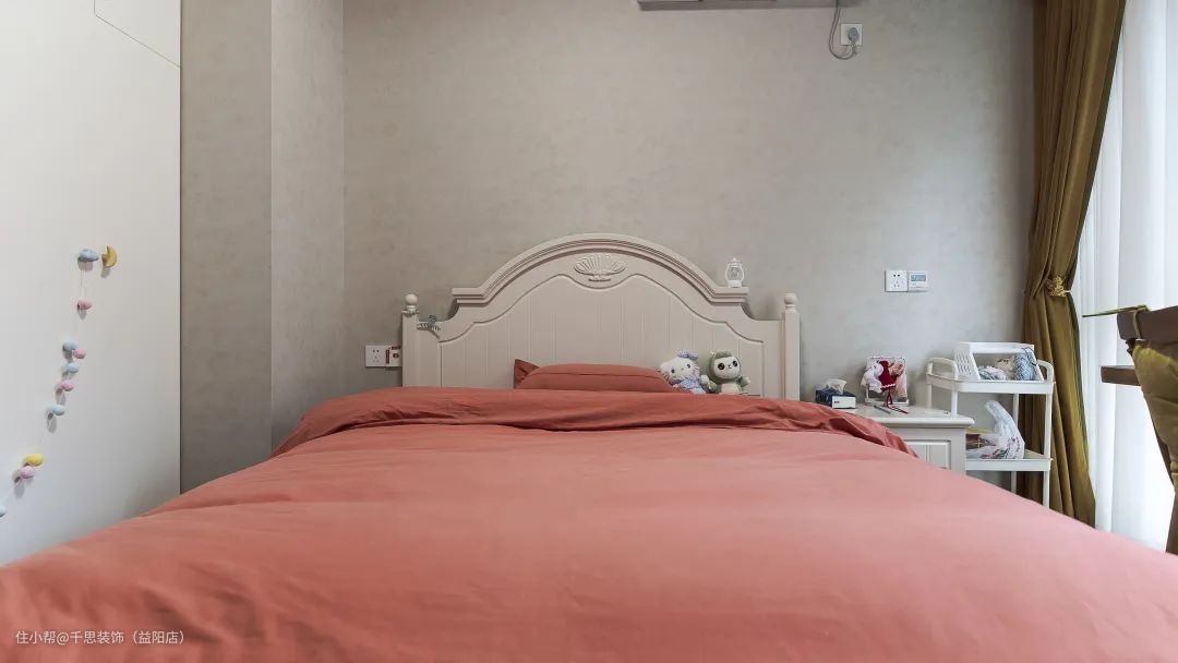 儿童房,不同于公区的古朴厚重,粉色的加入,多了几分柔和亮丽。背景墙以浅咖色填充并延伸。床头/床头柜/小推车,三者同一色系。