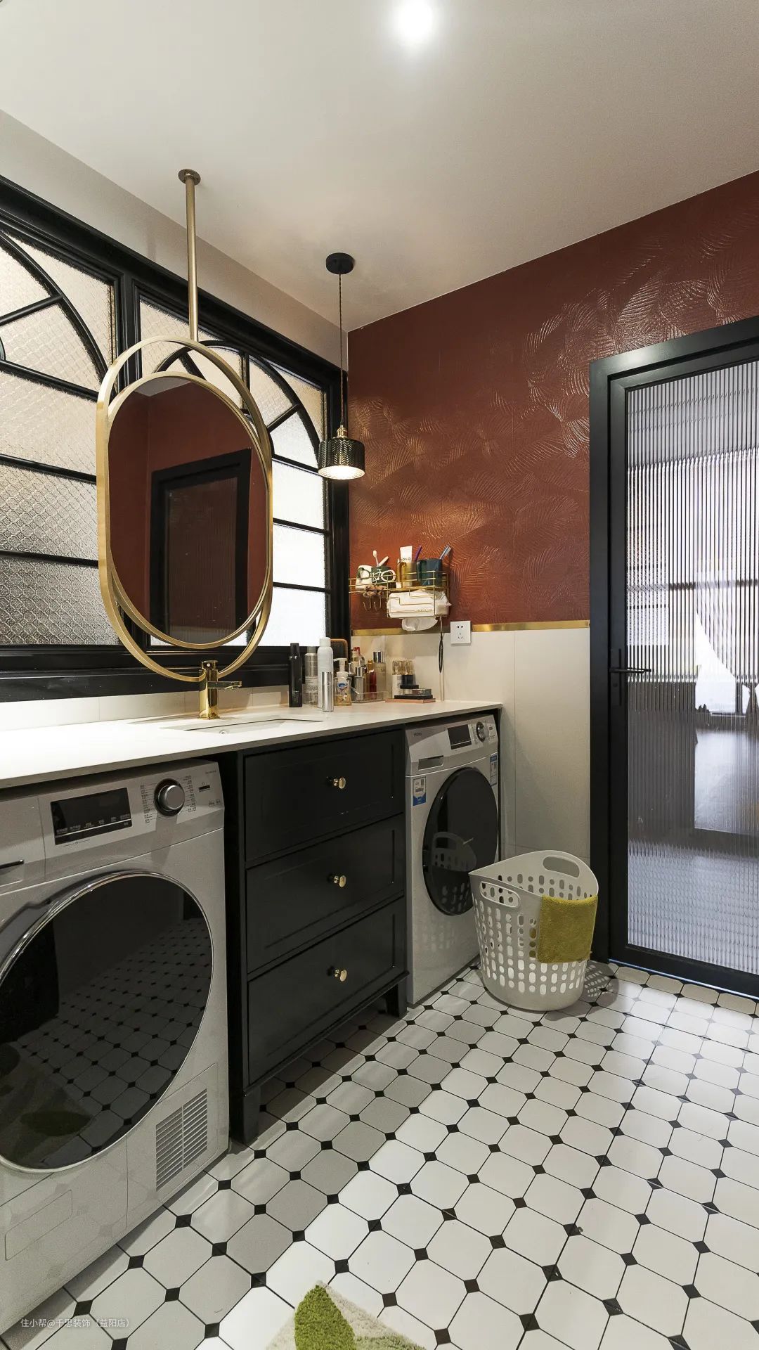 客卫空间,干湿分离。朱砂红拼接白色壁砖,中间安置一张铁艺圆镜,氛围感满满,鲜明的色彩碰撞,更具视觉延伸感,感受设计的魅力。