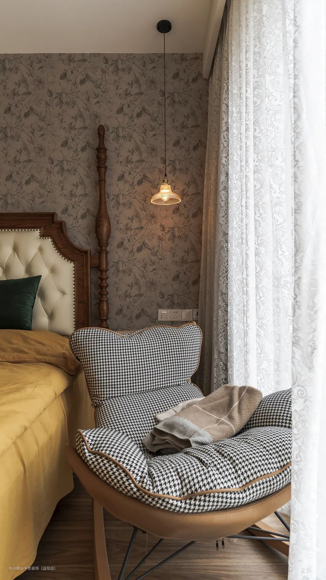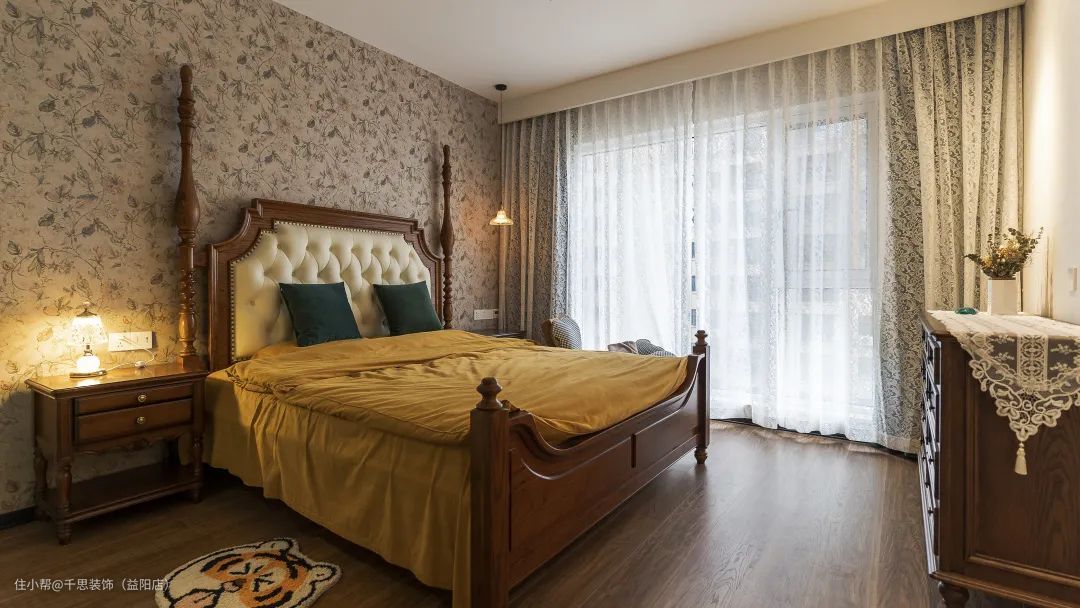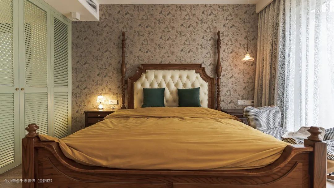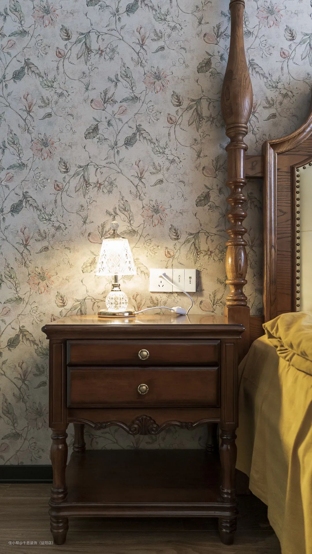 主卧,墙面以旧墙布装饰,选择胡桃色家具,给予居住者怀旧复古的感官体验。像是藏在记忆中的老影片,偶然翻阅,依旧动人心魄。整个卧室的风格,满是南洋复古风情。色系偏重,3000k的暖光床头灯+黄绿配套的床品,奶白色的床头反成空间点缀,浪漫复古。
