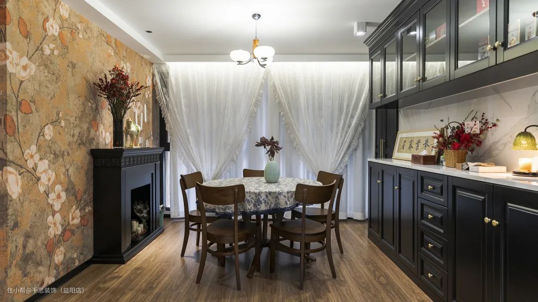 餐厅空间,以棕咖色为主调,延续客厅设计,背景墙以花卉墙布装饰,安置壁炉。深色圆桌置于中央,定制通顶黑色餐边柜,质感十足。