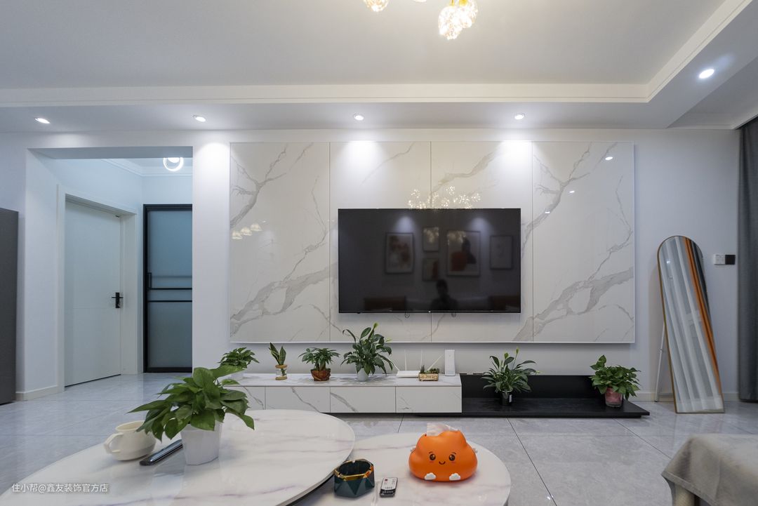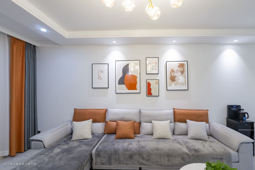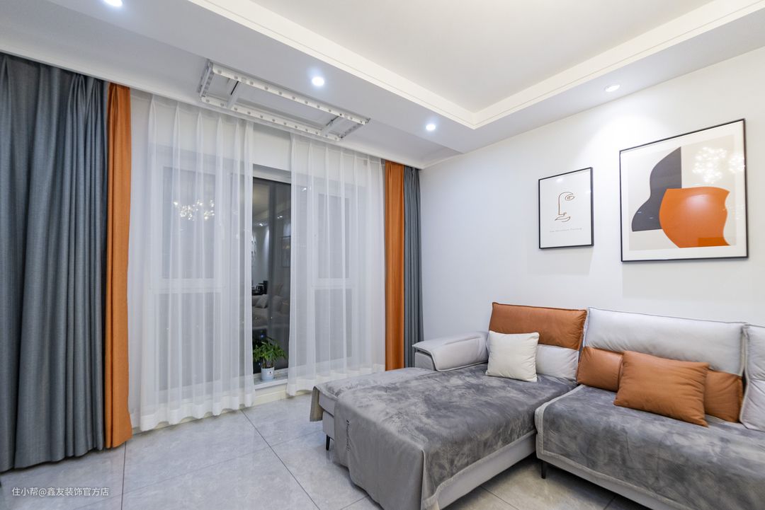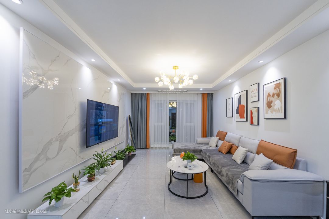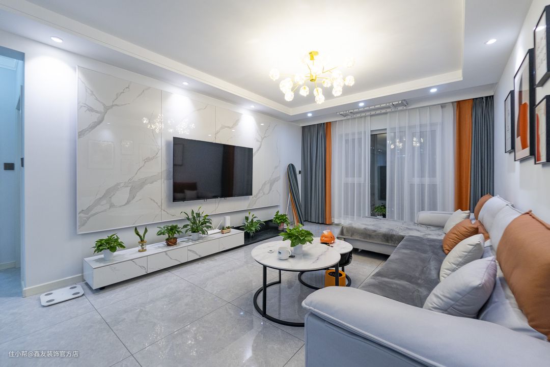 客厅以白色、灰色为主调,点缀橘色,透过不同颜色的石材,硬包壁布和皮革,让空间呈现出和谐的层次感,用干净的线条和不同的空间体块提供了开放的流动空间。