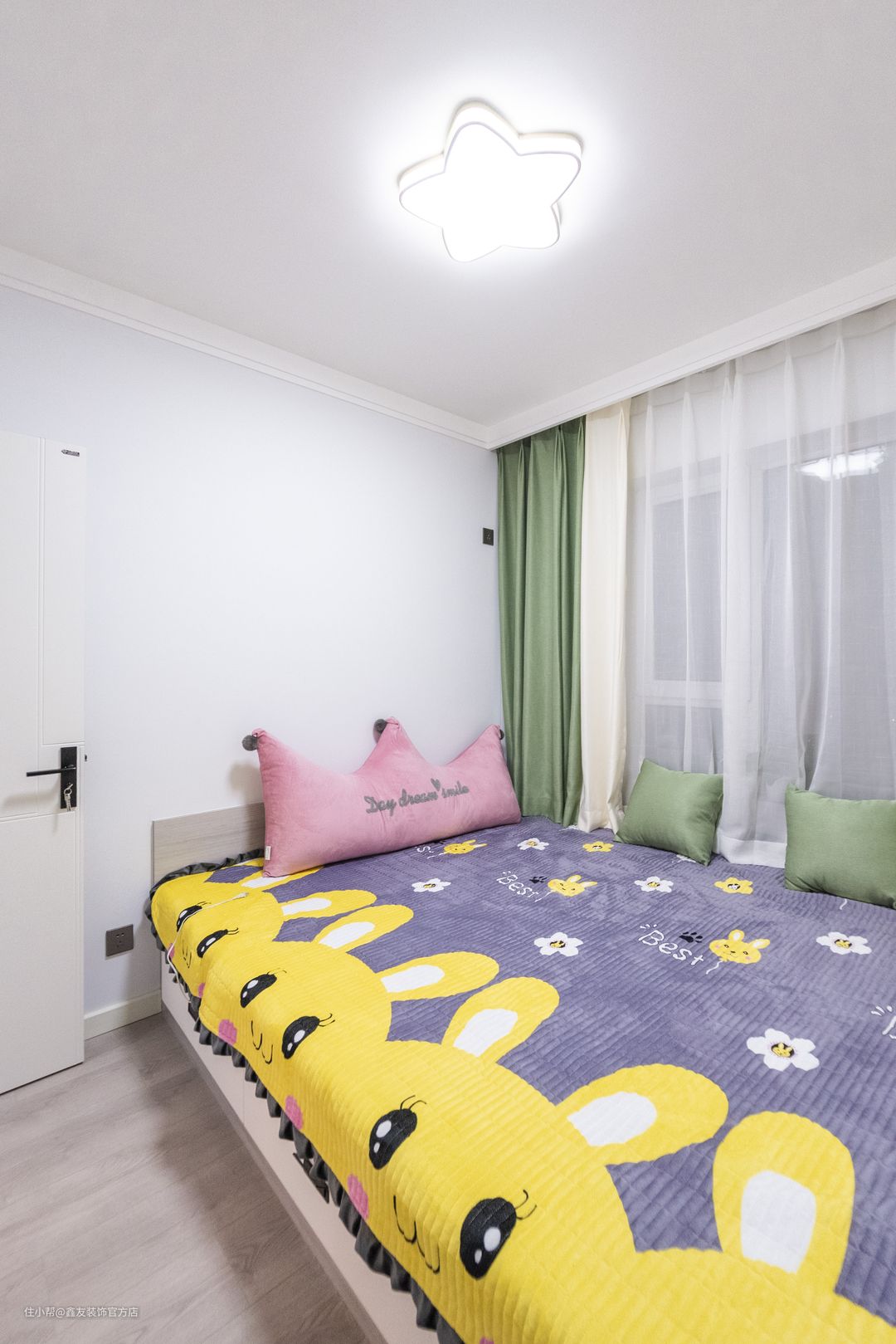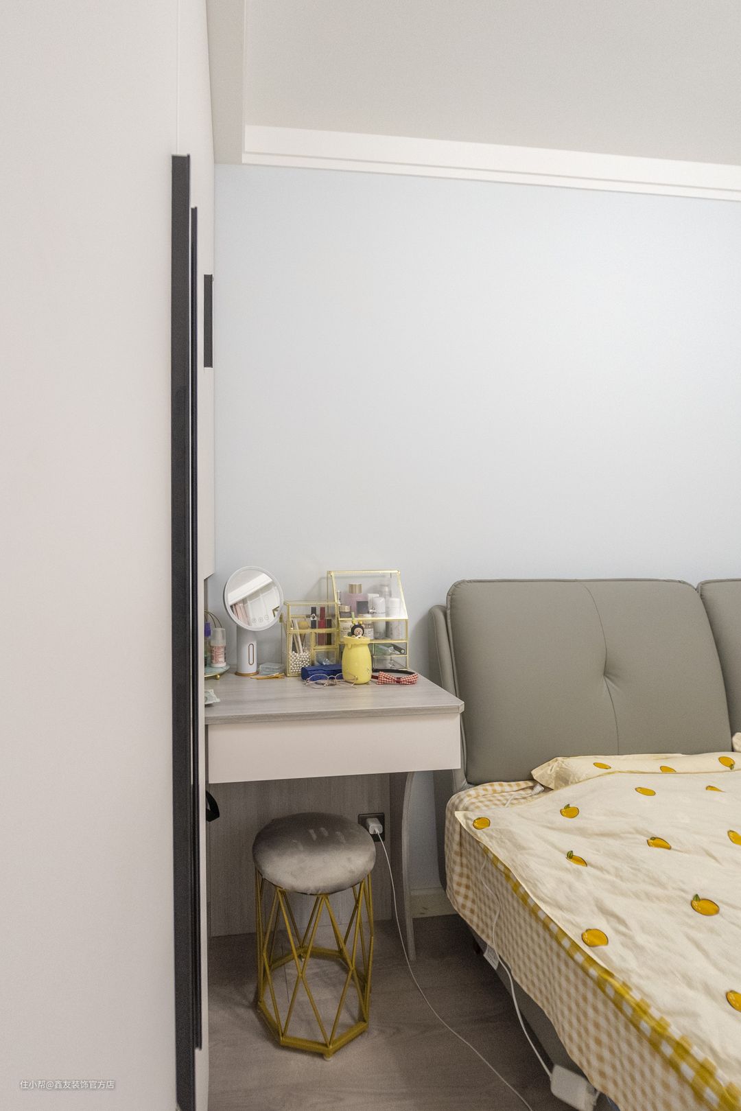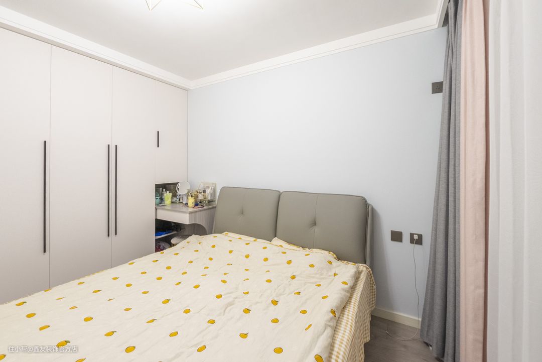 次卧设计以温柔的灰色和白色为主调,翠绿色透明窗帘的置入,让空间更显得清透明净,棉麻舒适床品的柔软相搭,让空间的质感构成平衡。