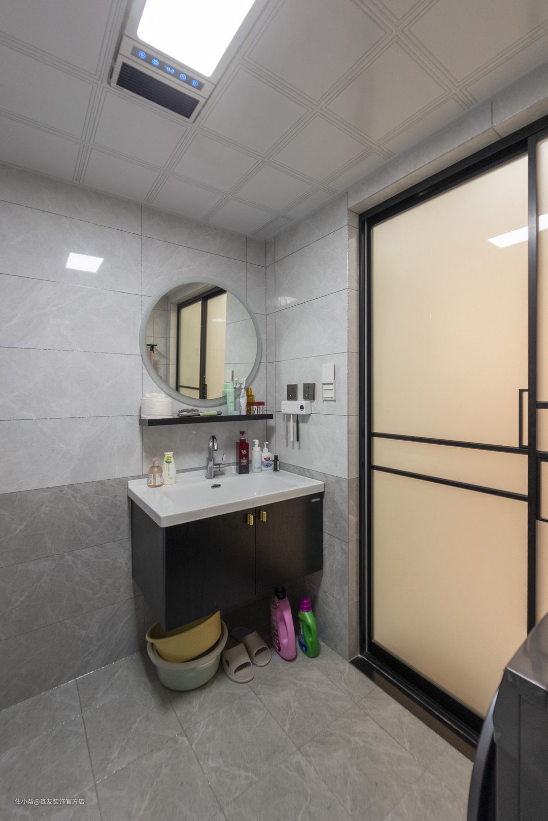 简单的设计,浅灰色的地砖和墙壁搭配白色的洗手池。卫生间用深色和浅色划分功能区域,合理规划出干湿分离。