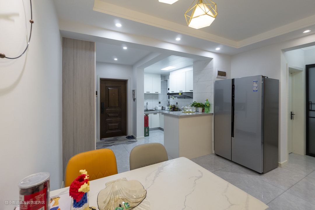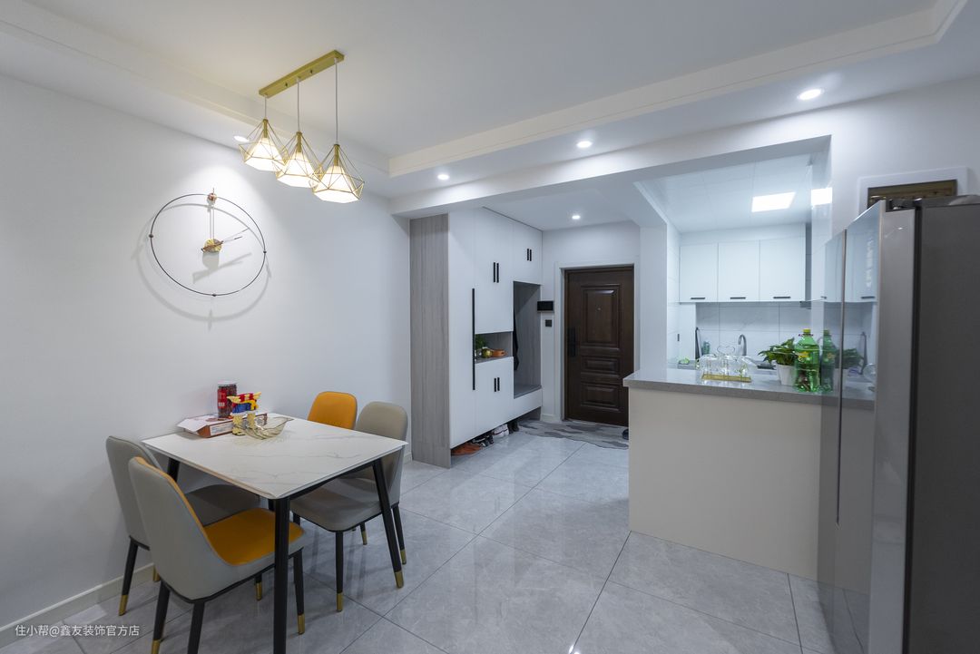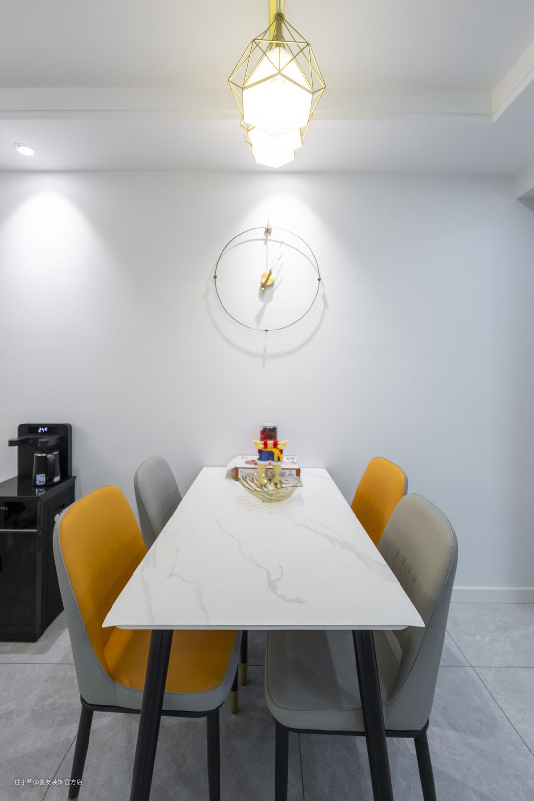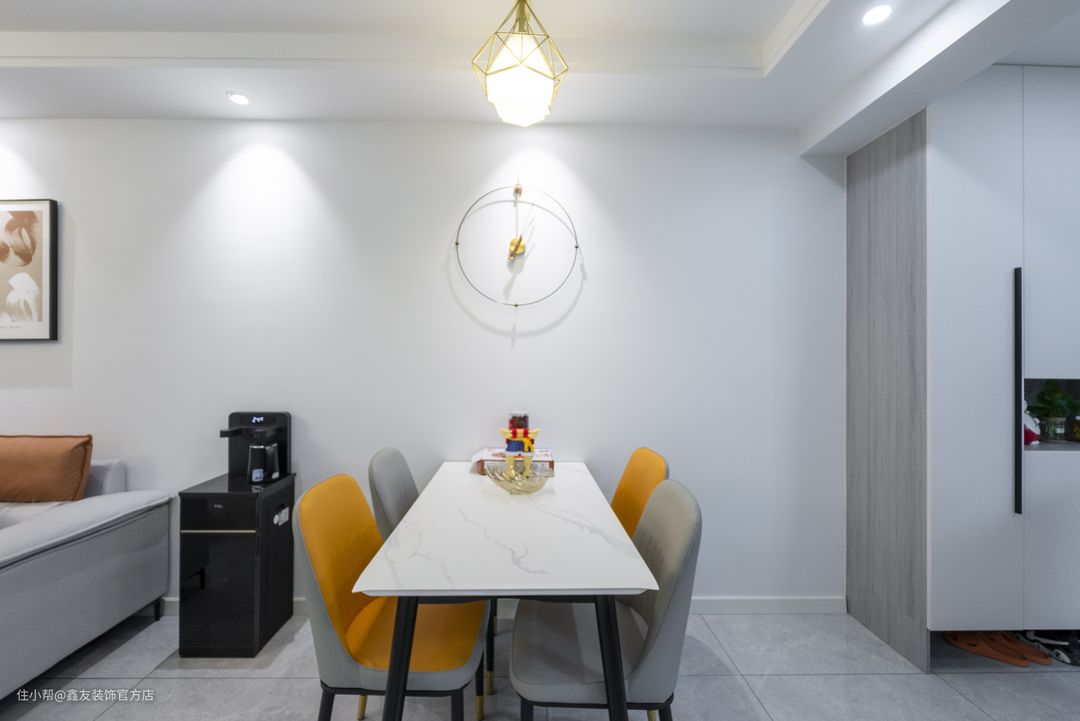 餐厅暖色系的灯光,营造温馨的就餐环境,灰和橙色的餐椅搭配与客厅沙发相呼应,保持整体色调一致。