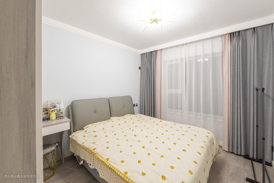 主卧的床头的灰色柜子简单实用,白色的棉麻窗帘让室内的气氛柔和而温馨。
