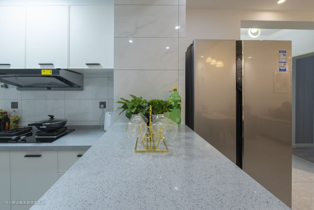 L型厨房,增加厨房的活动空间,充分利用每一平方米,开放式的厨房配个中岛台,这是标配了。不过正因为厨房是开放式的设计,让空间也更宽敞明亮了。利用定制柜的优势将厨电嵌入进去,获得更多的料理空间。
