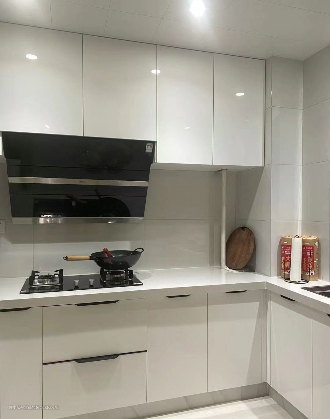 地柜是瓷砖柜体,吊柜是木柜体,柜门是欧松板高光白,石英石做的台面 瓷砖是纯白色的+石云灰美缝,装的筒灯,避免切菜做饭的时候背光