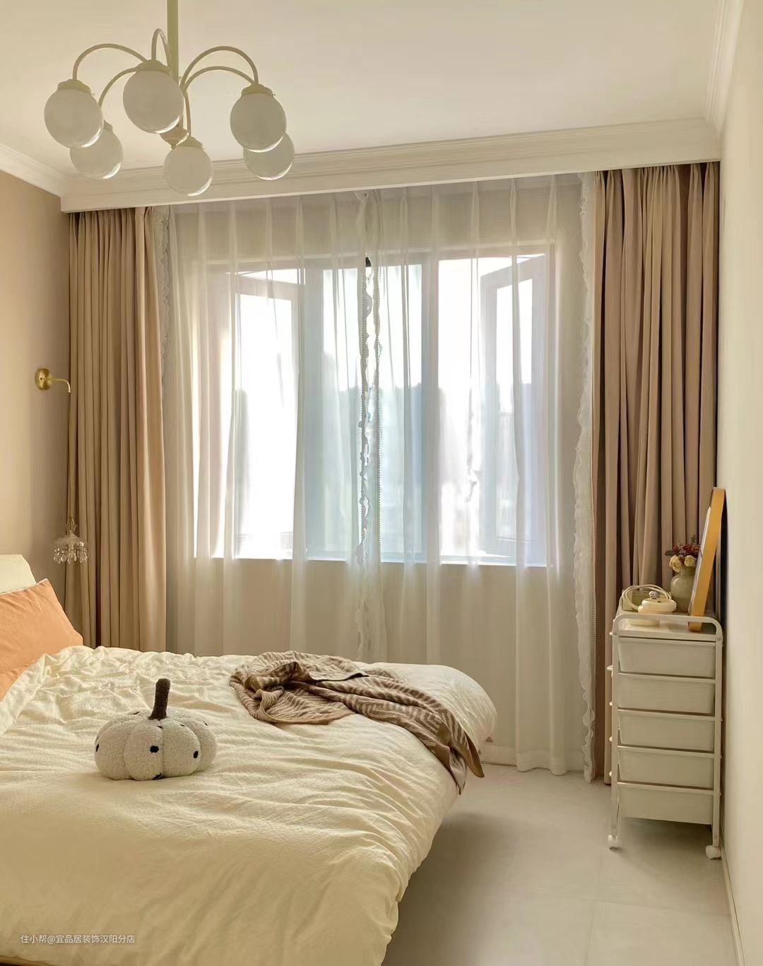 窗帘是奶茶色+带珍珠花边的金刚纱 床和床头柜是真皮的奶白色,灯是白色花朵吊灯