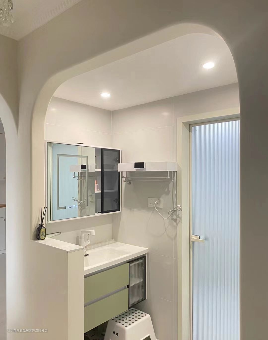 半墙的设计增加通透性,半墙台面是纯白色的人造汉白玉 墙砖是纯白柔光砖,地面是绿色小花砖,乳胶漆是杏子灰 卫生间门是超白长虹+超白磨砂,透光不透人