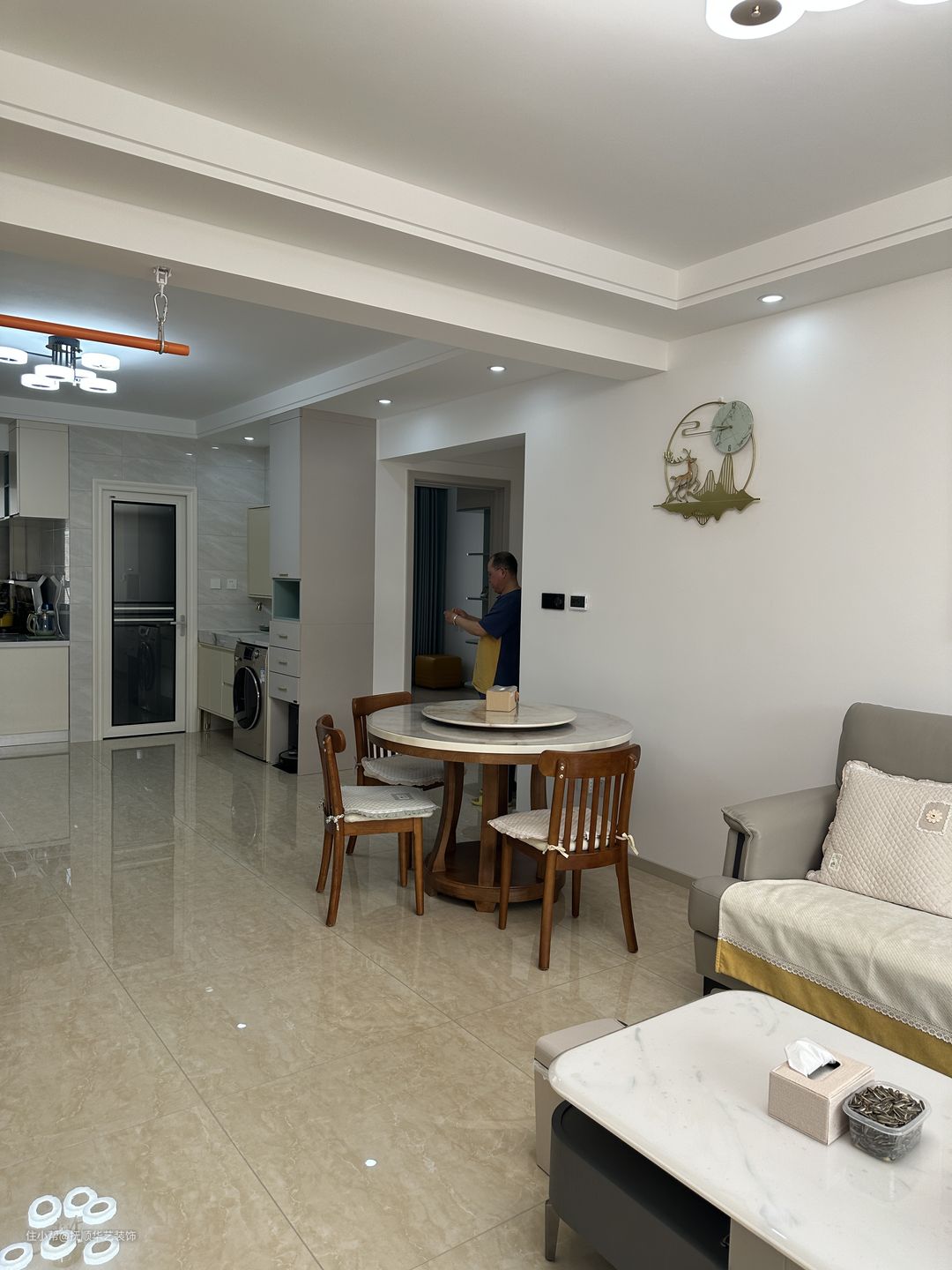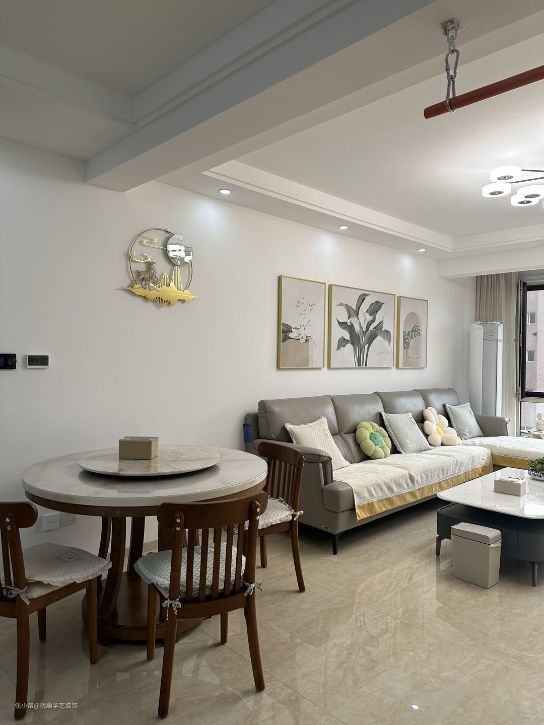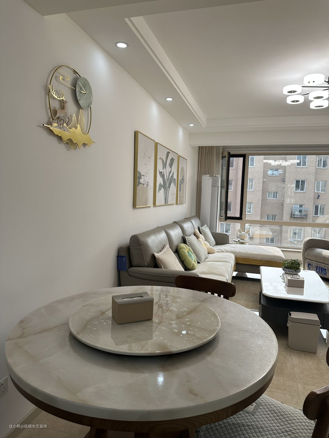 餐厅与客厅相连,整体延续客厅浅色的格调,营造干净简约的氛围。木质打底的餐桌搭配大理石的台面,使空间在暖色的色调上有了跳跃,焕发温润的气息。